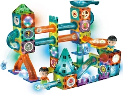 Αυτή η φωτιζόμενη πίστα με μπίλιες προσφέρει ώρες δημιουργικού παιχνιδιού. Τα κομμάτια συνδέονται εύκολα με μαγνήτες ή κουμπωτές συνδέσεις, ώστε τα παιδιά να μπορούν να χτίζουν 3D κατασκευές γεμάτες ράμπες, θηλιές και εμπόδια. Τα LED εξαρτήματα και οι πλευρικοί προβολείς χαρίζουν εντυπωσιακό φωτισμό στην πίστα και ενισχύουν την εμπειρία παιχνιδιού.