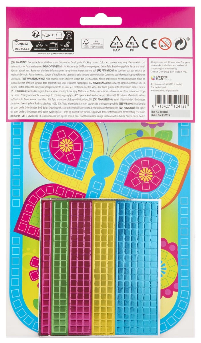 Αυτό το δημιουργικό σετ περιλαμβάνει όλα όσα χρειάζεστε για να φτιάξετε ένα λαμπερό μωσαϊκό με μοτίβο πεταλούδας. Αρκεί να ακολουθήσετε τις χρωματικές σημάνσεις στο πρότυπο και να κολλάτε σταδιακά τα μεταλλικά αφρώδη τετραγωνάκια στα σωστά σημεία. Το αποτέλεσμα είναι μια λαμπυρίζουσα εικόνα μεγέθους A5, που θα χαροποιήσει μικρούς δημιουργούς και γονείς.