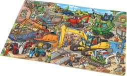 Αυτό το μεγάλο εικονογραφημένο βιβλίο οδηγεί τους μικρούς αναγνώστες στον πολυάσχολο κόσμο της οικοδομής, όπου δουλεύουν διάφορα μηχανήματα έργου – από έναν κόκκινο εκσκαφέα με διπλά ελαστικά και έναν πράσινο τροχοφόρο φορτωτή έως ένα κίτρινο ερπυστριοφόρο σκαπτικό. Πολύχρωμες και ευανάγνωστες σκηνές καλλιεργούν την περιέργεια και την ανάπτυξη της λεπτής κινητικότητας και της λογικής σκέψης.