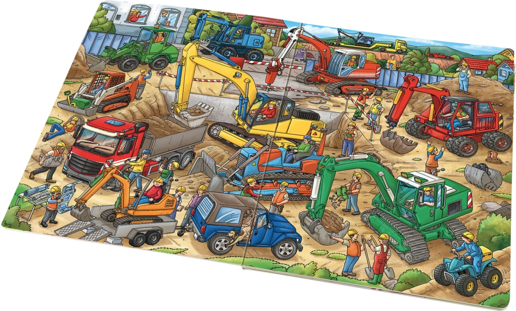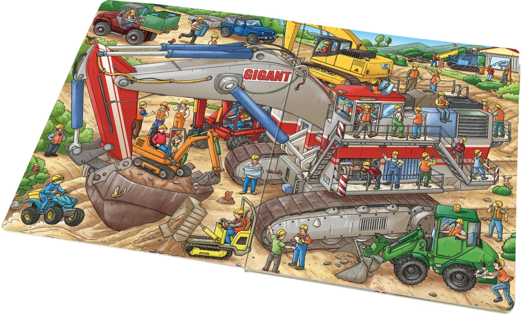 Μεγάλες σκηνές γεμάτες χρώμα και λεπτομέρειες βυθίζουν τα παιδιά στον κόσμο των εκσκαφέων, των φορτωτών και των γερανών, ενισχύοντας την περιέργεια και τη φαντασία τους.
