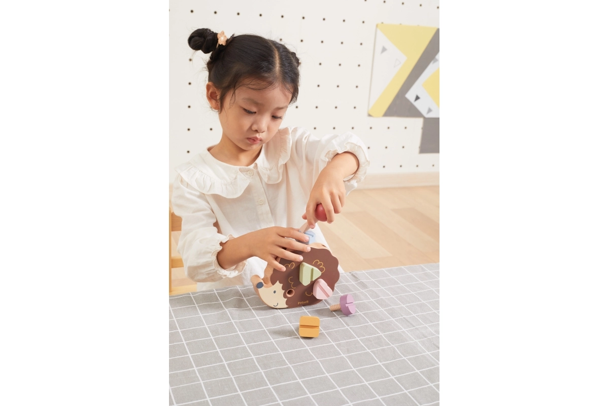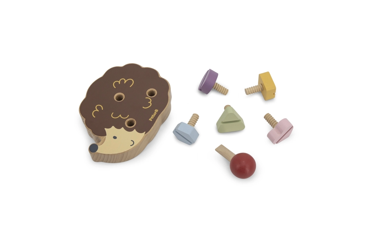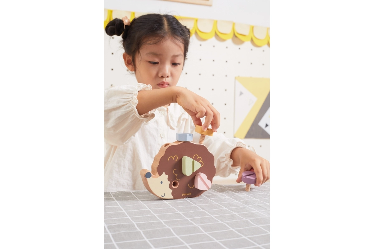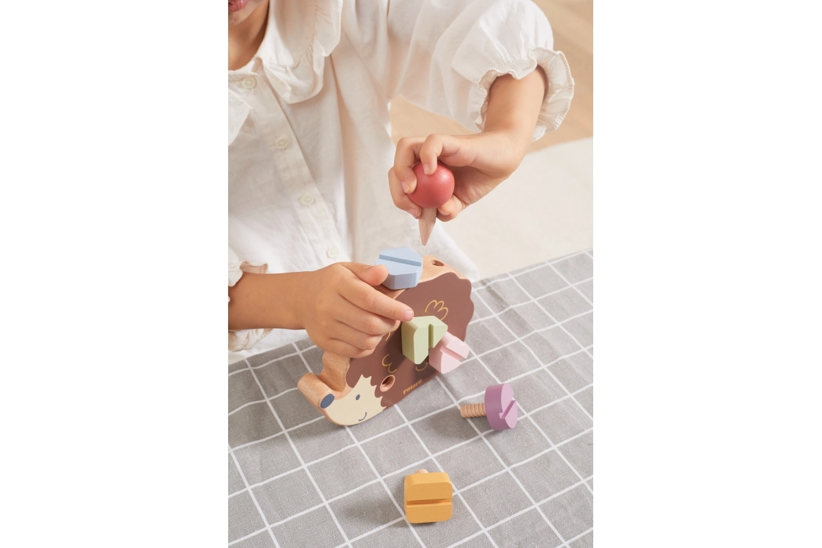 Ο ξύλινος σκαντζόχοιρος επιτρέπει στα παιδιά να εξασκούν τη λεπτή κινητικότητα με βίδες σε διάφορα χρώματα και σχήματα.