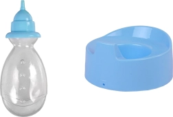 Πλήρης εξοπλισμός για τη φροντίδα της κούκλας: διάφανο μπιμπερό και μπλε γιογιό για εξάσκηση υγιεινής και διασκεδαστικές σκηνές.