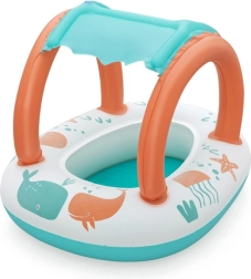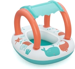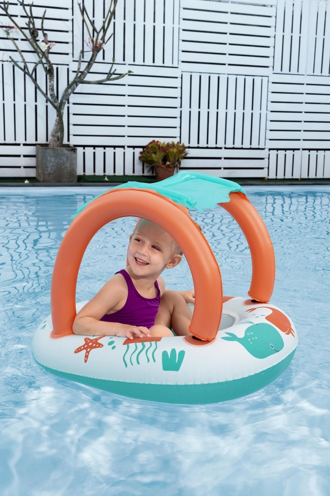 Ελαφριά και άνετη βάρκα για τους μικρούς, που συνδυάζει διασκεδαστικά θαλάσσια γραφικά με πρακτική τέντα με προστασία UV. Το αποσπώμενο σκίαστρο στερεώνεται με βέλκρο, ώστε να το προσαρμόζετε εύκολα στις καιρικές συνθήκες και την ένταση του ήλιου. Χάρη στον κλειστό χώρο καθίσματος με ανοίγματα για τα ποδαράκια, τα παιδιά απολαμβάνουν σταθερό και ασφαλές παιχνίδι στο νερό.