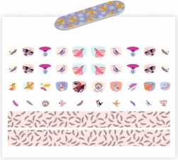 - Περιεχόμενο σετ: 30 αυτοκόλλητα νυχιών, 10 μικρότερα αυτοκόλλητα, 1 λωρίδα με σχέδια για κόψιμο, 1 λίμα νυχιών.