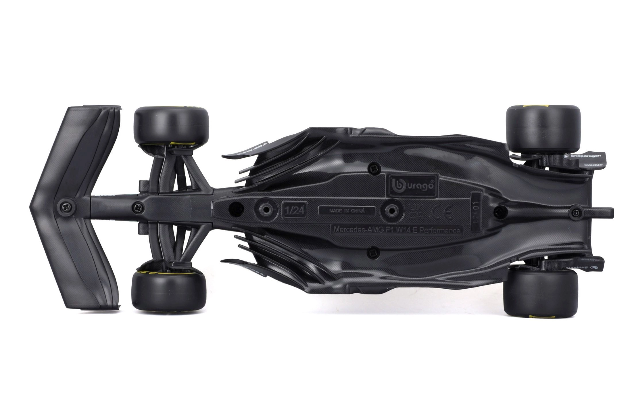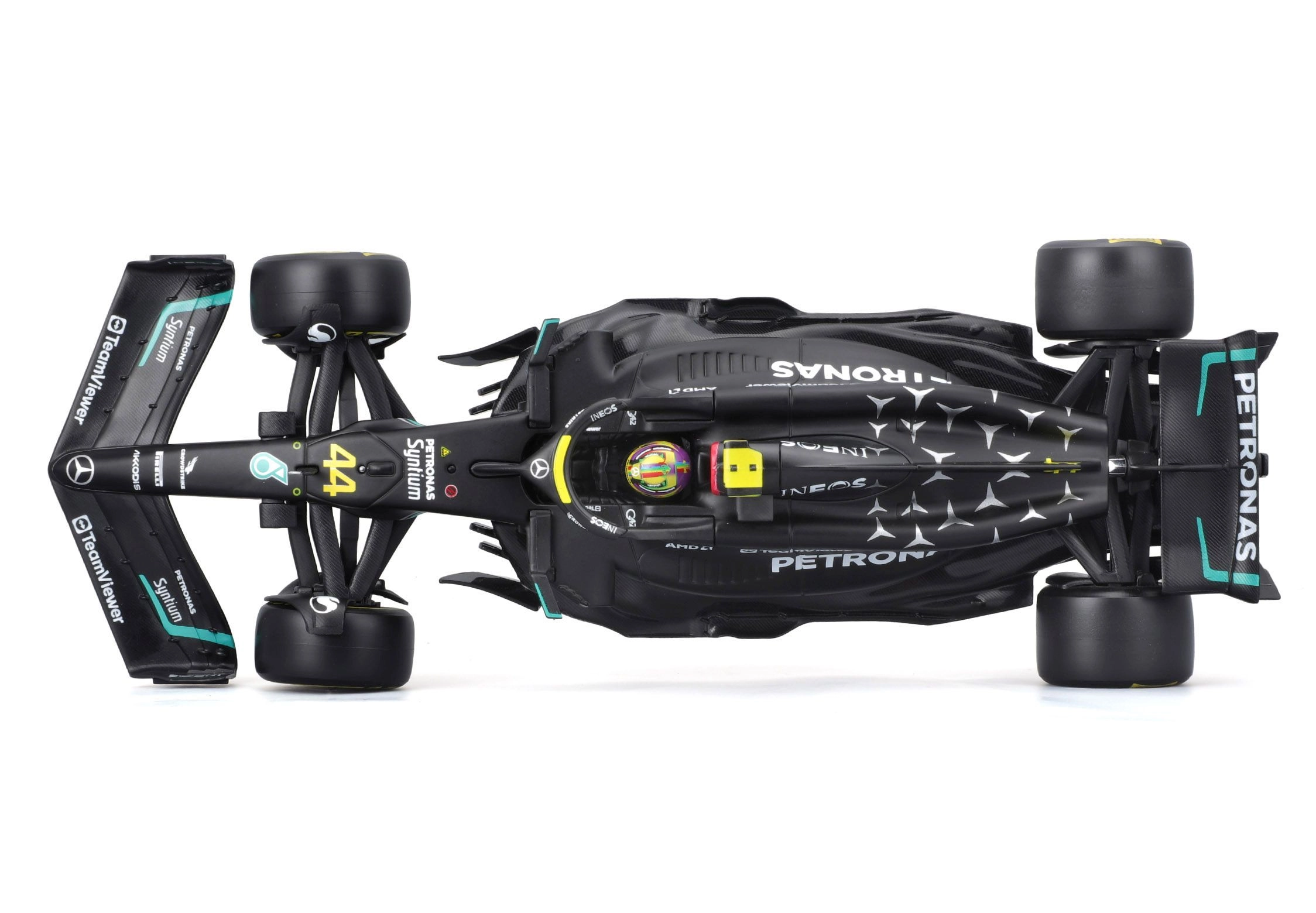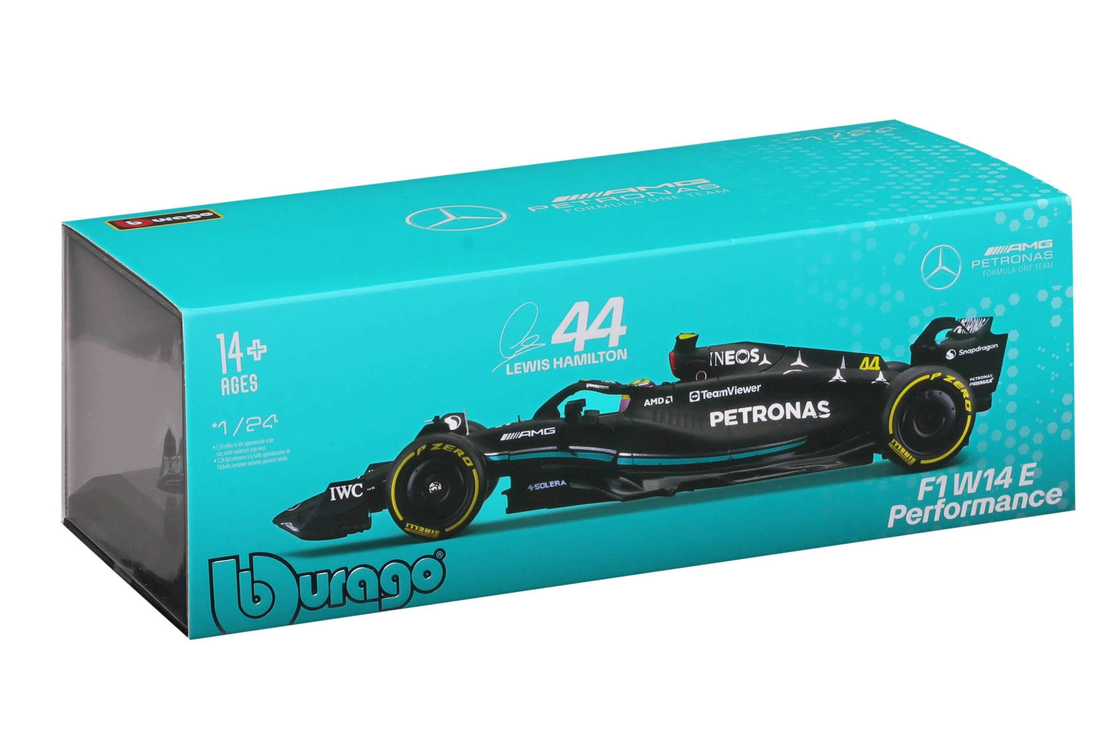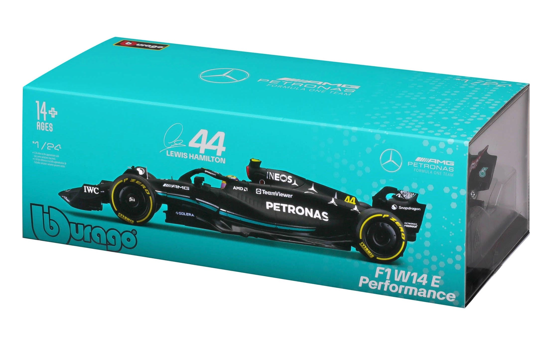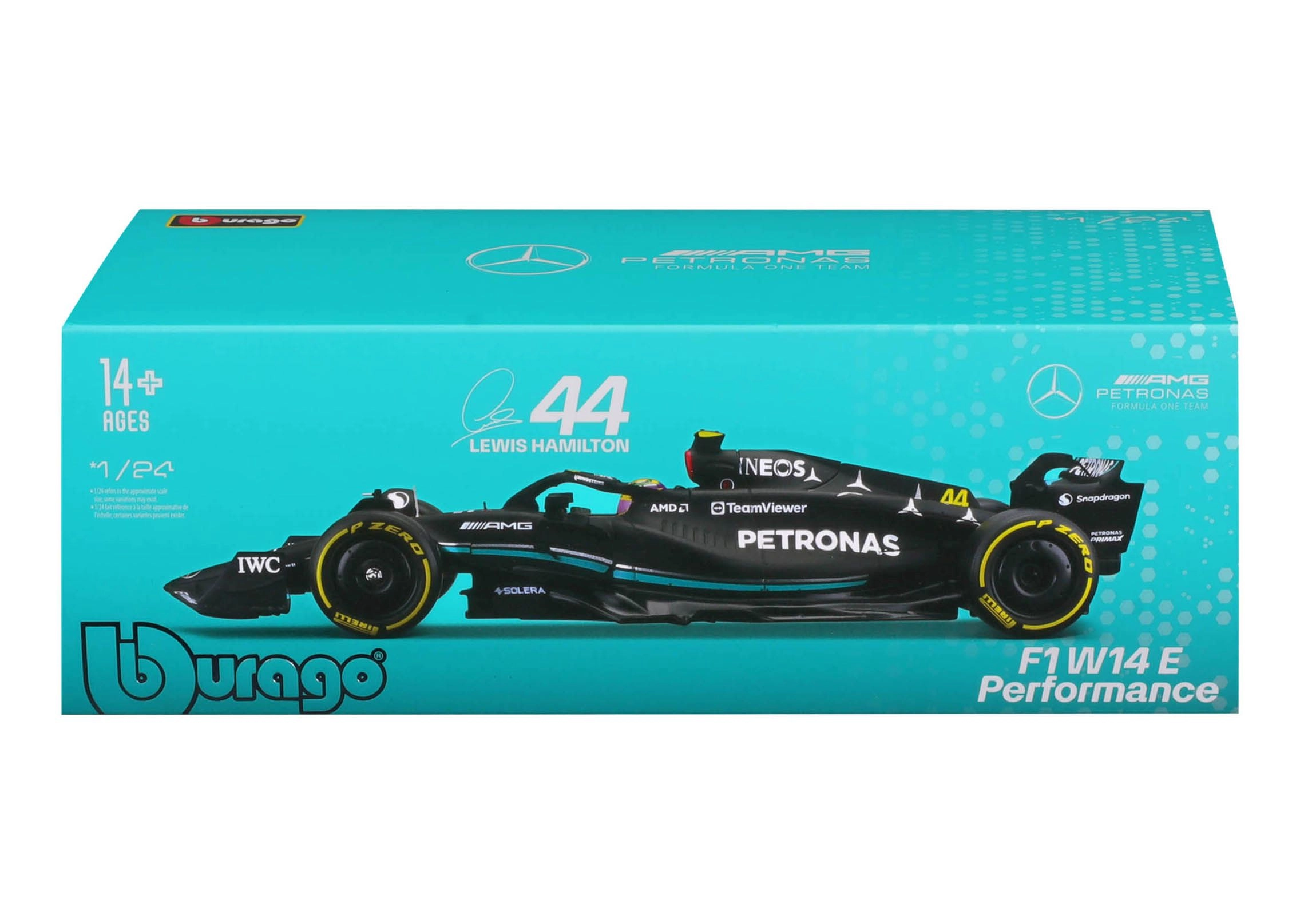 Πιστά γραφικά χορηγών, ακριβείς αναλογίες και το εμβληματικό μαύρο-τιρκουάζ σχήμα του W14 προσδίδουν συλλεκτική αξία στο μοντέλο.