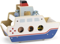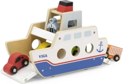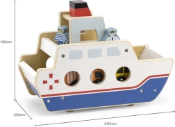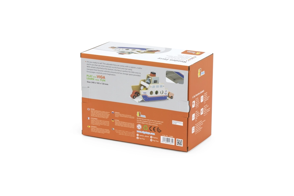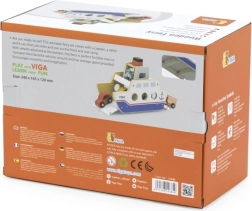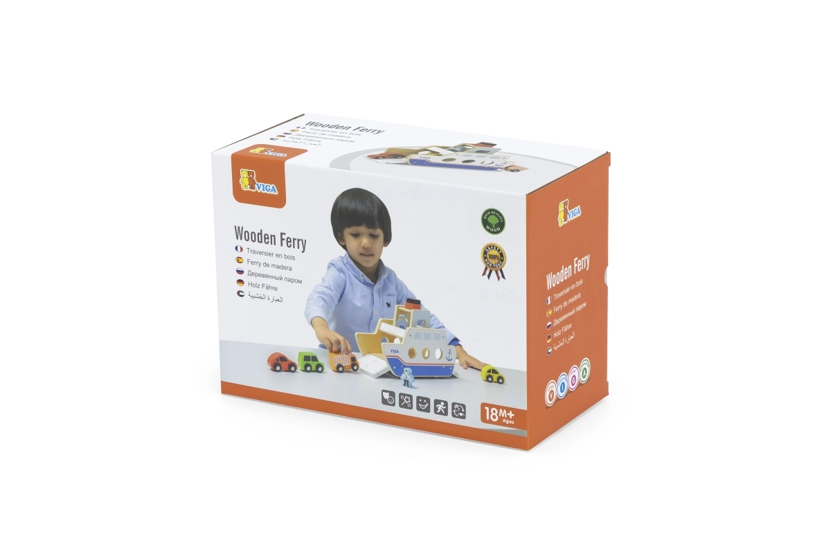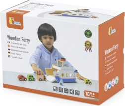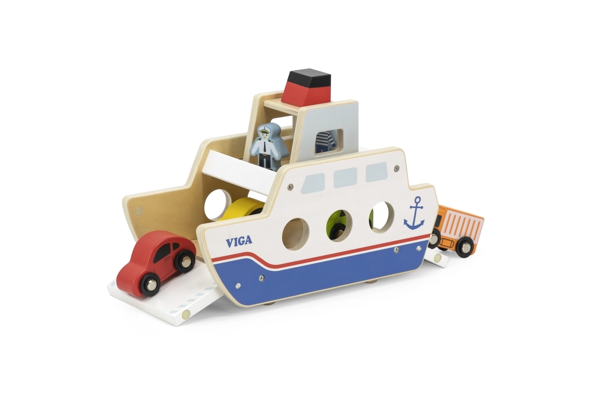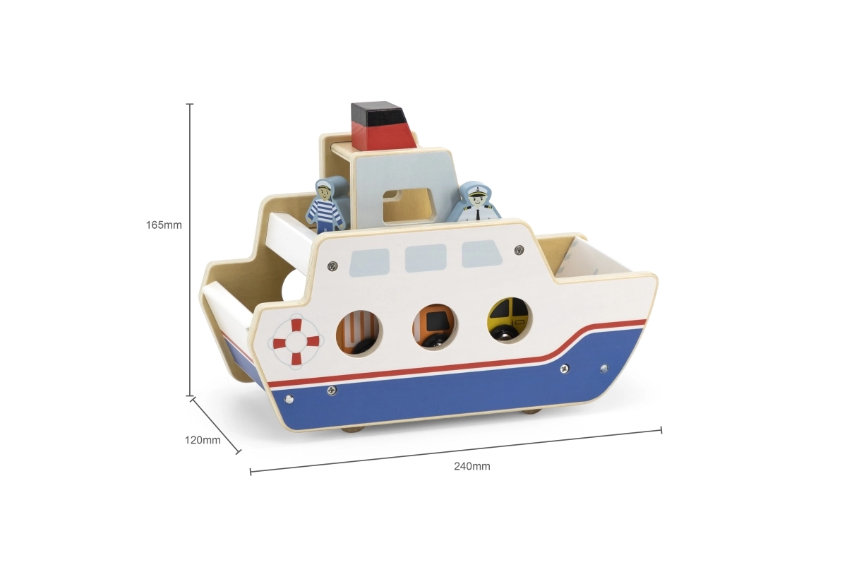 Αυτό το ποιοτικό ξύλινο φεριμπότ θα ενθουσιάσει όλους τους μικρούς λάτρεις των οχημάτων και των πλοίων. Το πλοίο κινείται σε ροδάκια, ώστε να μετακινείται εύκολα, και διαθέτει ανακλινόμενες ράμπες και στις δύο πλευρές, για άνετη επιβίβαση και αποβίβαση των αυτοκινήτων. Η στιβαρή κατασκευή και τα λεία άκρα είναι ιδανικά για παιδιά από 18 μηνών.