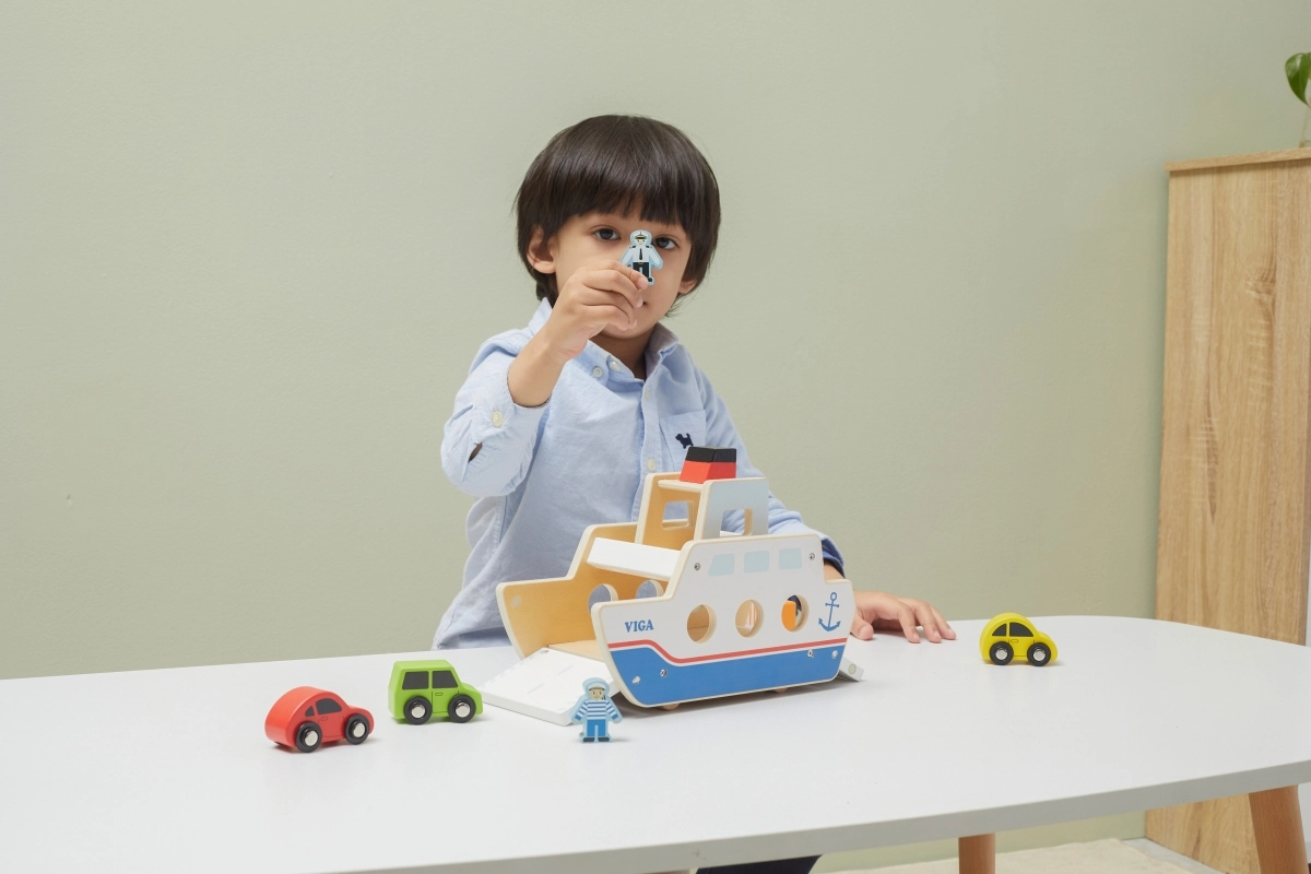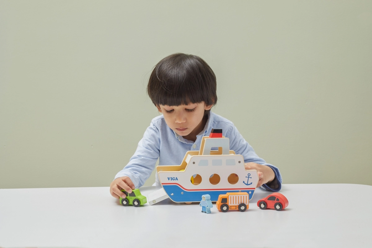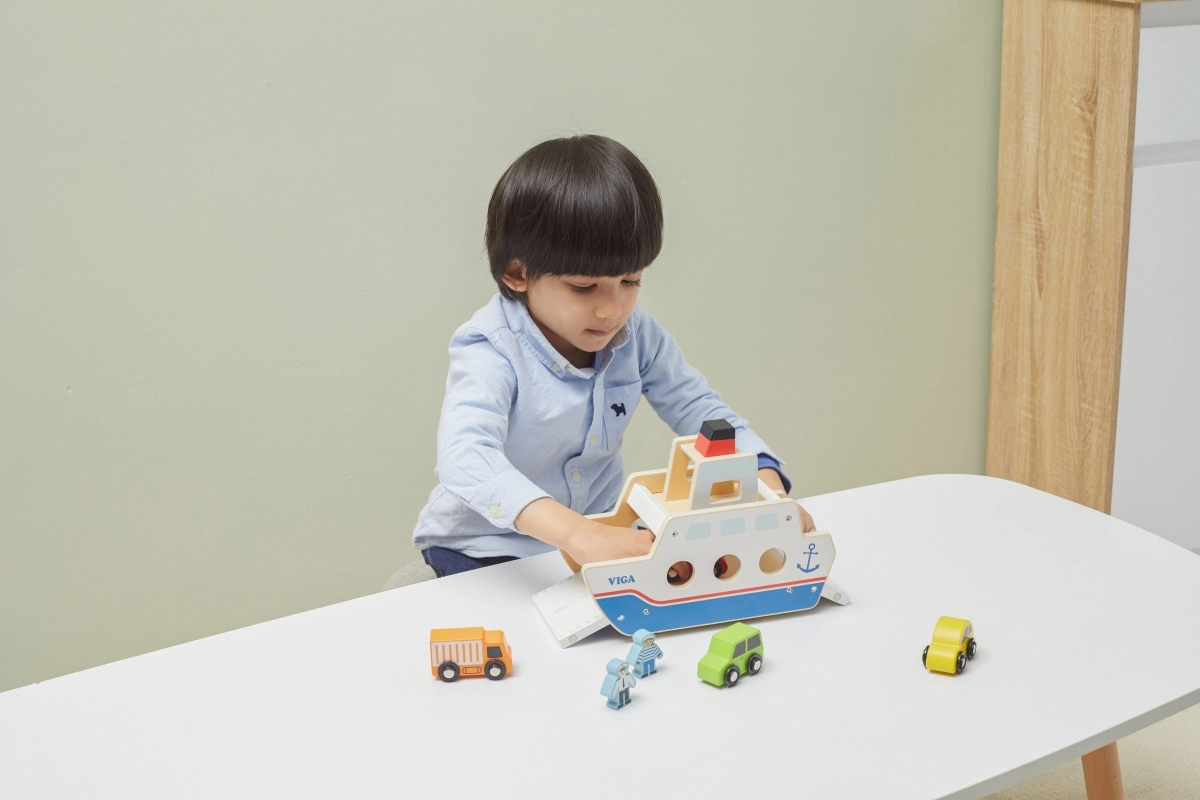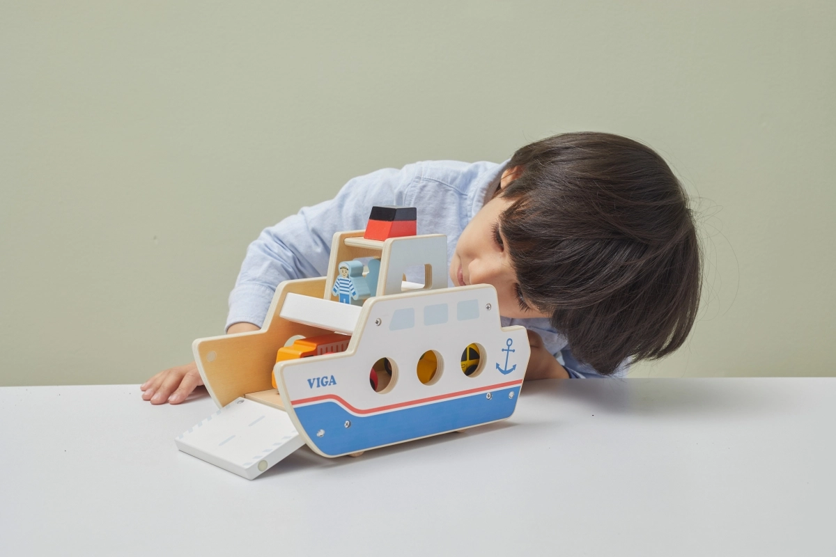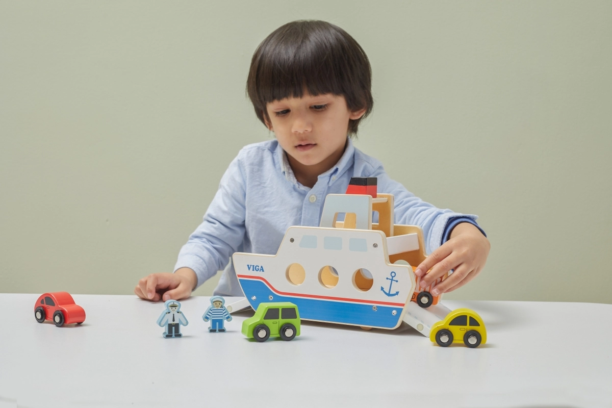 Αυτό το ποιοτικό ξύλινο φεριμπότ θα ενθουσιάσει όλους τους μικρούς λάτρεις των οχημάτων και των πλοίων. Το πλοίο κινείται σε ροδάκια, ώστε να μετακινείται εύκολα, και διαθέτει ανακλινόμενες ράμπες και στις δύο πλευρές, για άνετη επιβίβαση και αποβίβαση των αυτοκινήτων. Η στιβαρή κατασκευή και τα λεία άκρα είναι ιδανικά για παιδιά από 18 μηνών.