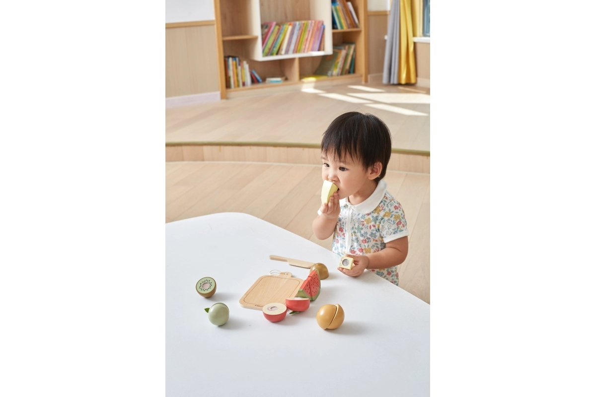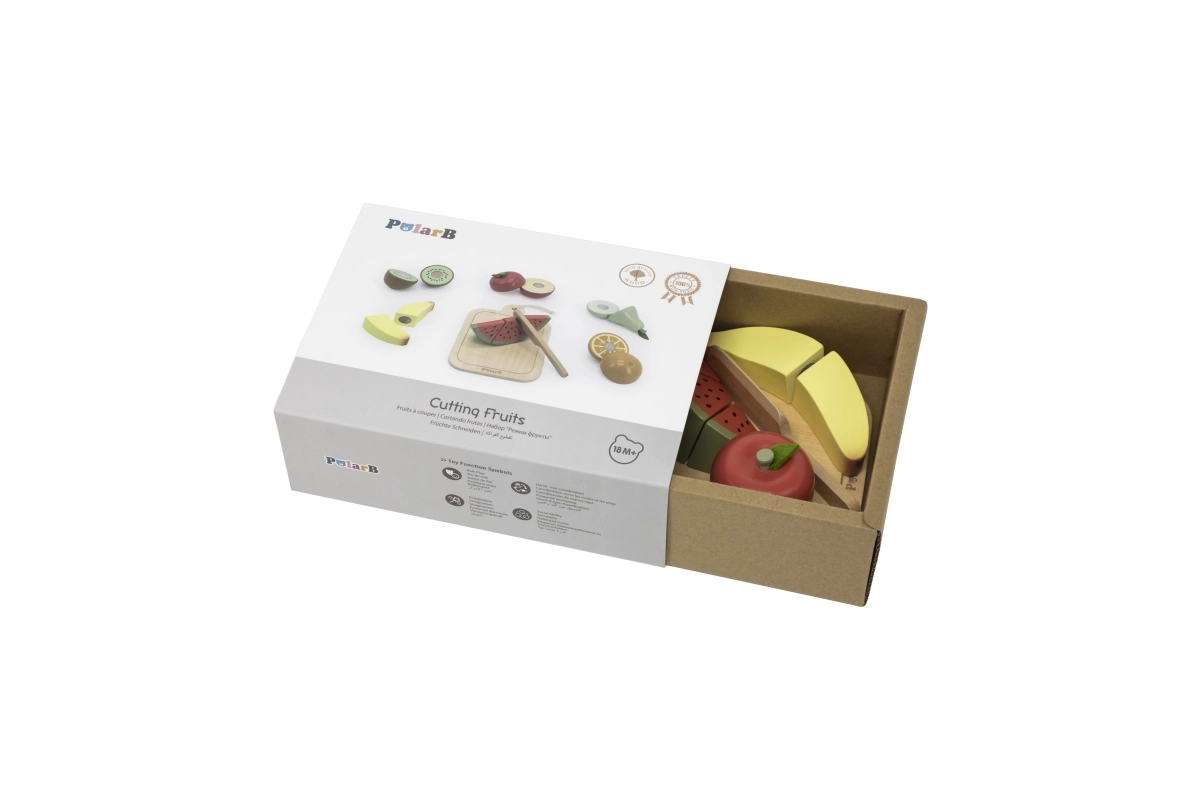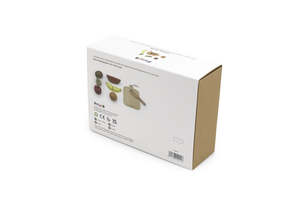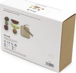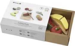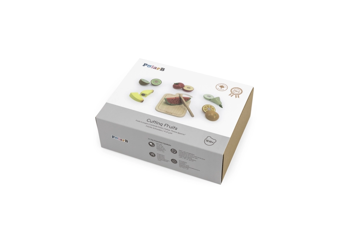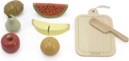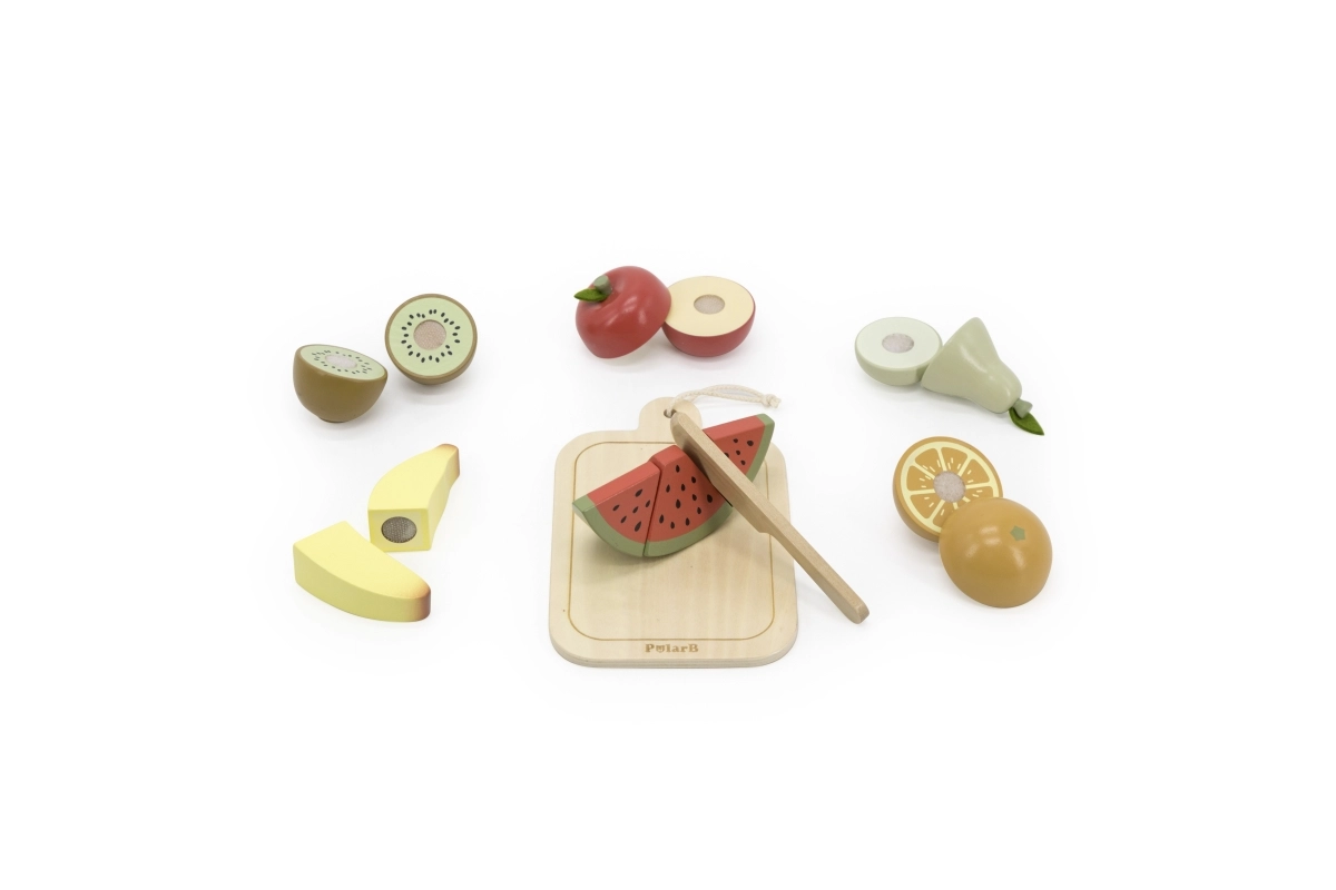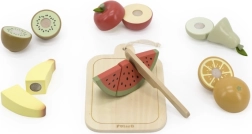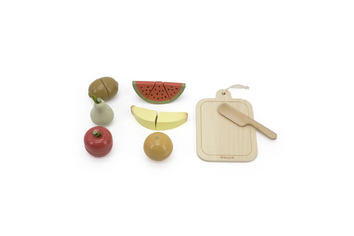 Σας παρουσιάζουμε το υπέροχο σετ ξύλινων φρούτων κοπής, ιδανικό για μικρούς μάγειρες και σεφ! Το σετ περιλαμβάνει σανίδα κοπής, μαχαίρι και έξι κομμάτια διαφορετικών φρούτων, τα οποία είναι χωρισμένα στη μέση και ενωμένα με βέλκρο. Έτσι, τα παιδιά μπορούν να δημιουργούν τους δικούς τους συνδυασμούς φρούτων και να εξασκούνται με ασφάλεια στην κοπή.