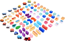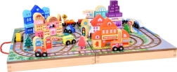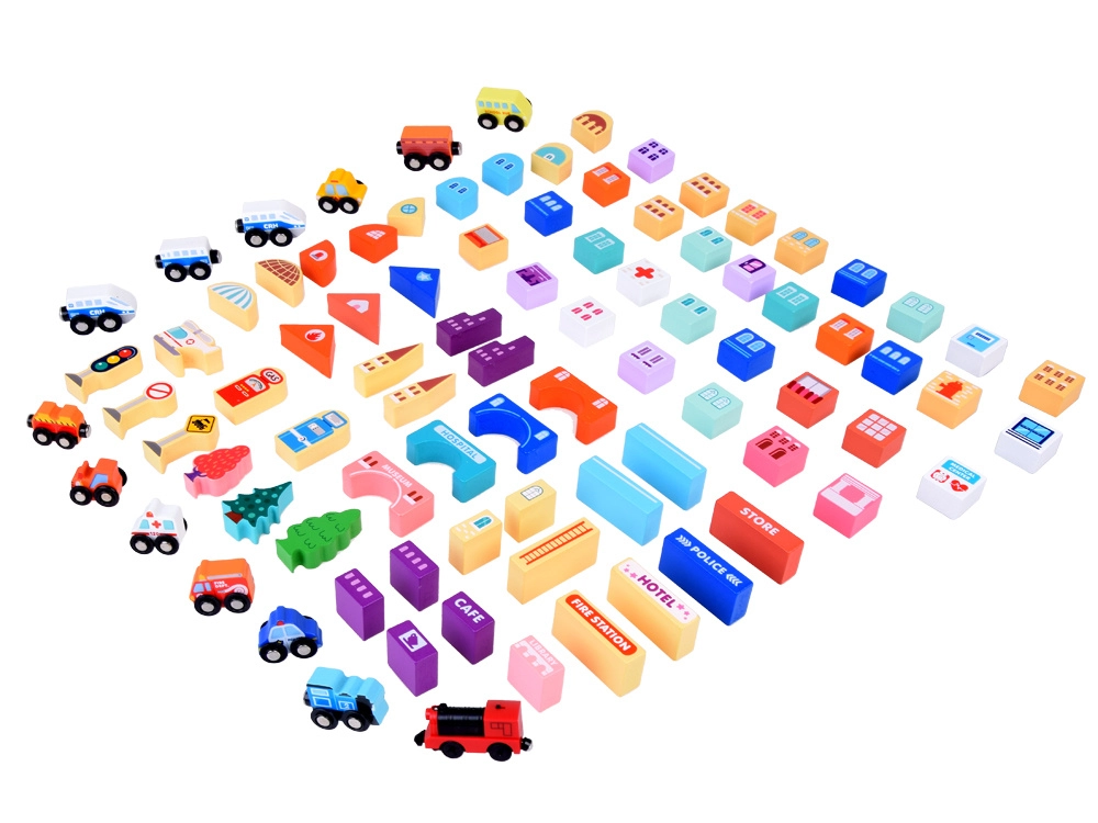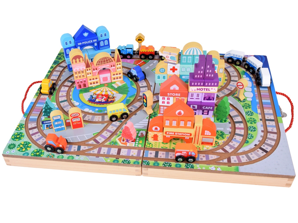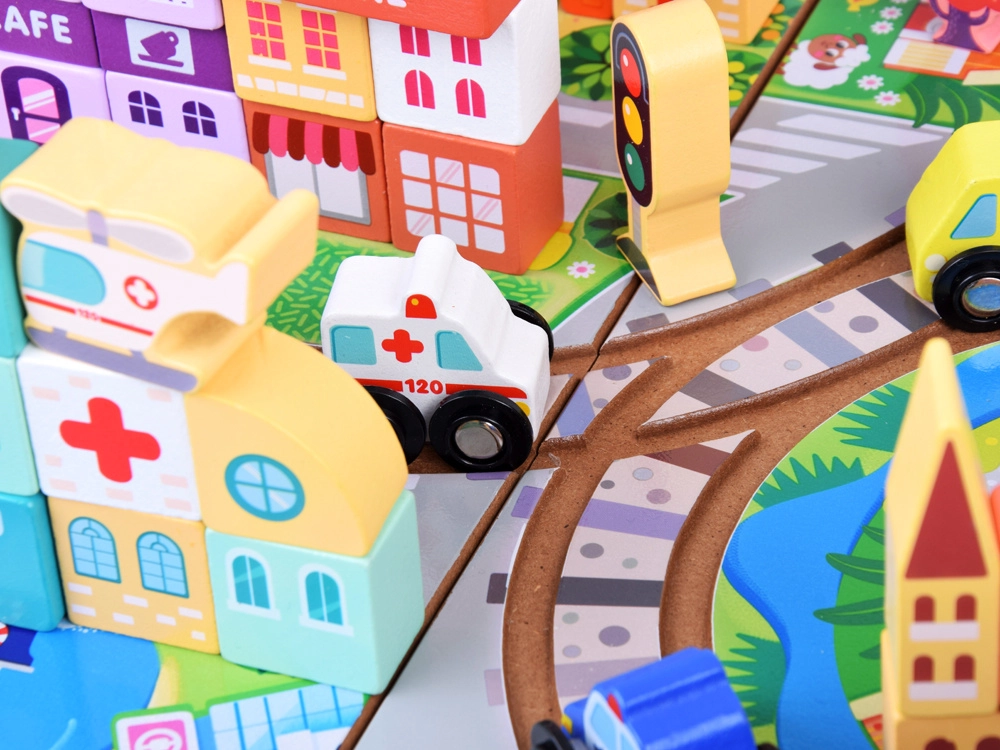 Περιλαμβάνει διάφορα πολύχρωμα ξύλινα τουβλάκια για τη συναρμολόγηση μιας πόλης, που ενισχύουν τη δημιουργικότητα και την αντίληψη κατά την κατασκευή.