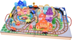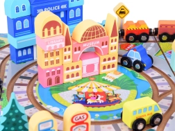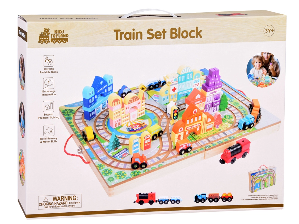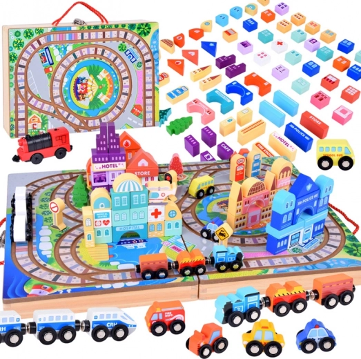 Ανακαλύψτε τον συναρπαστικό κόσμο των ξύλινων κατασκευών με αυτό το ξύλινο σετ πόλης, που προσφέρει 89 στοιχεία διασκέδασης. Το σετ περιλαμβάνει τροχιές, τρένα με μπαταρία και διάφορα πολύχρωμα τουβλάκια για την κατασκευή μοναδικών κτιρίων.