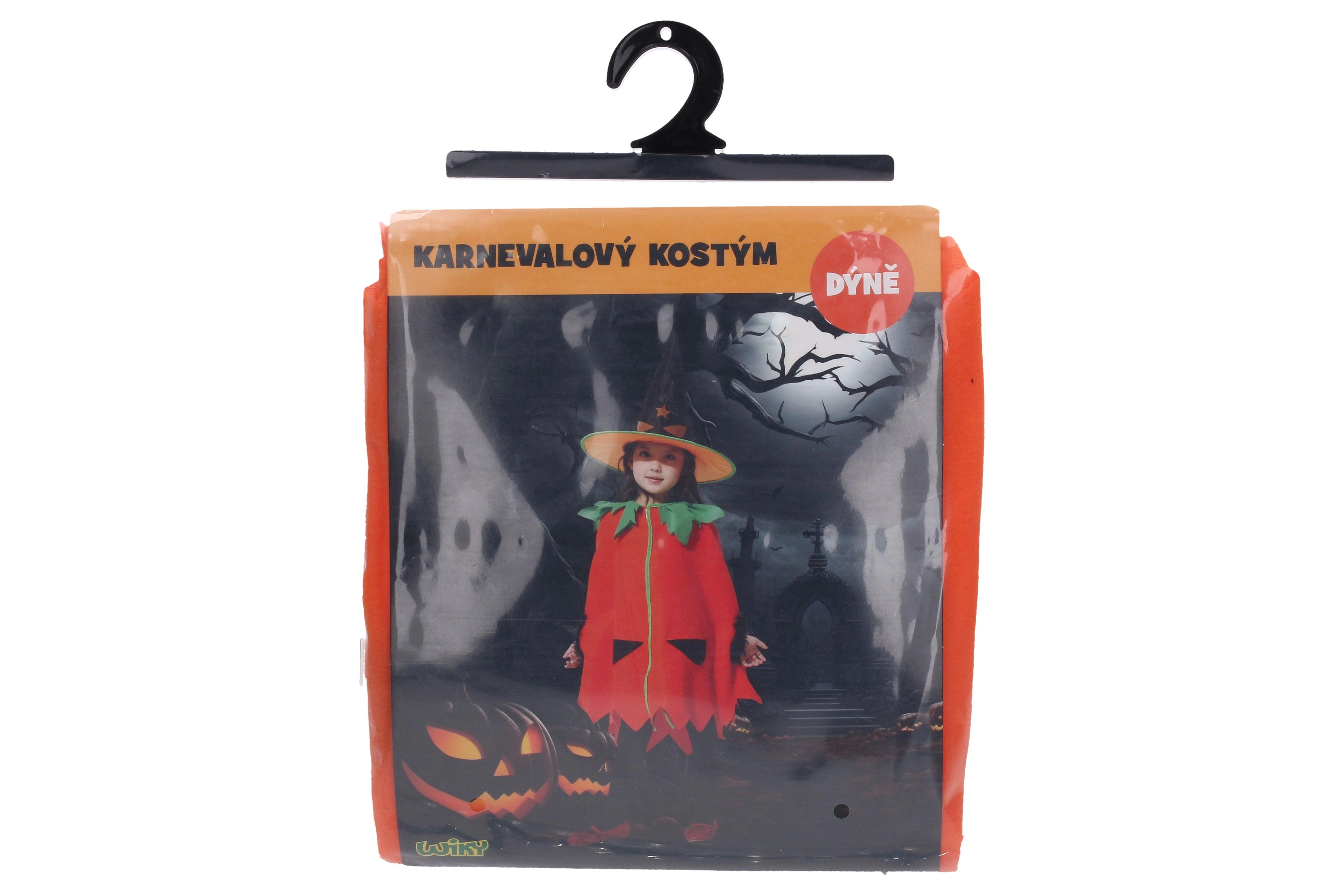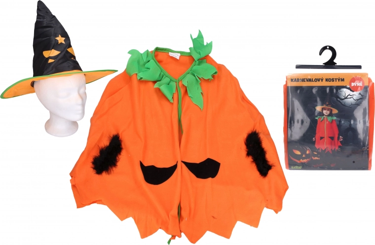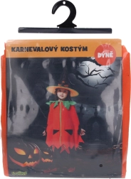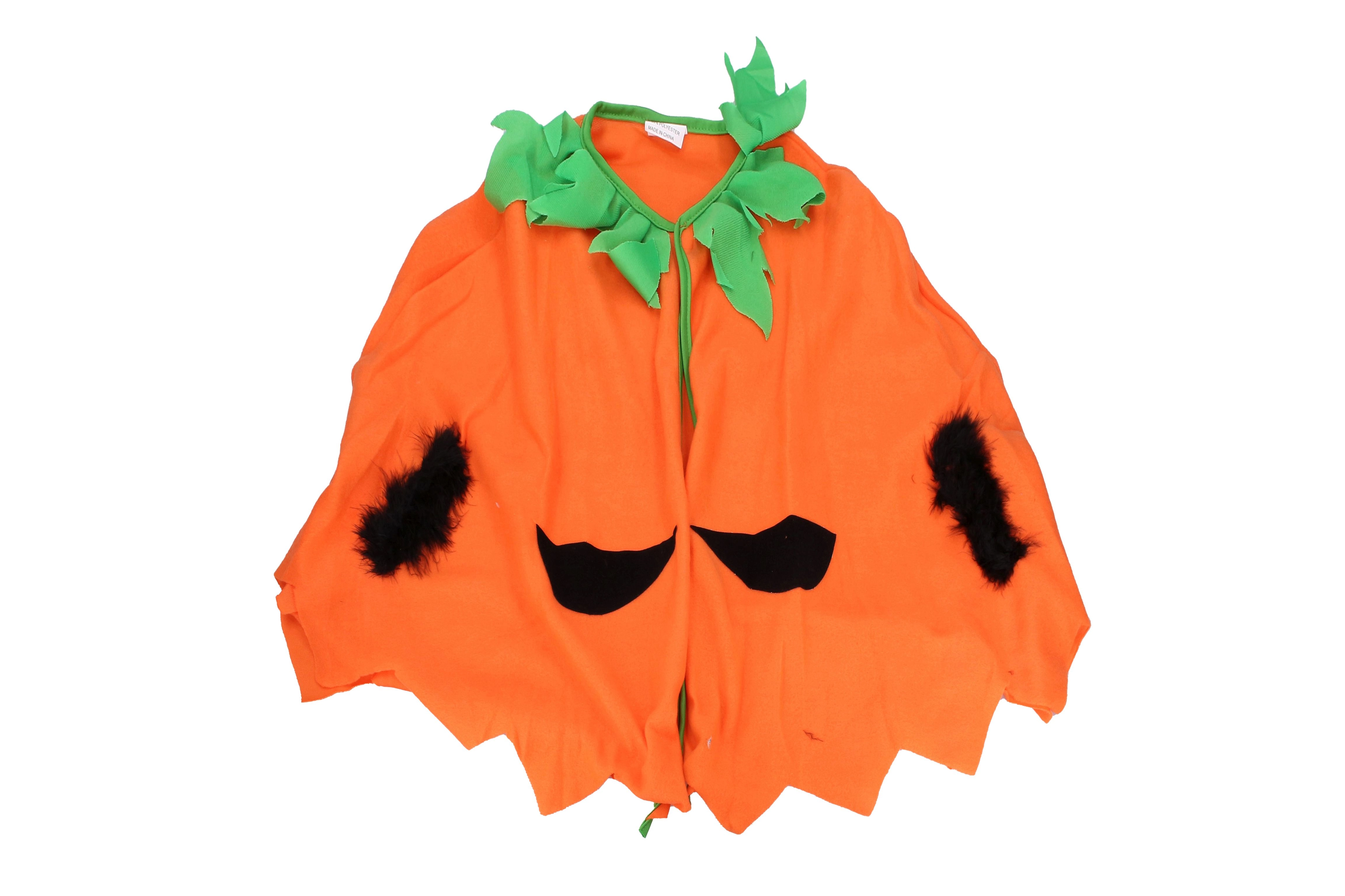 Χαριτωμένη και εύκολη στο φόρεμα αποκριάτικη στολή κολοκύθας για παιδιά ύψους 110–120 cm. Περιλαμβάνει μανδύα και καπέλο, ιδανική για απόκριες, Halloween και παιδικά πάρτι.
