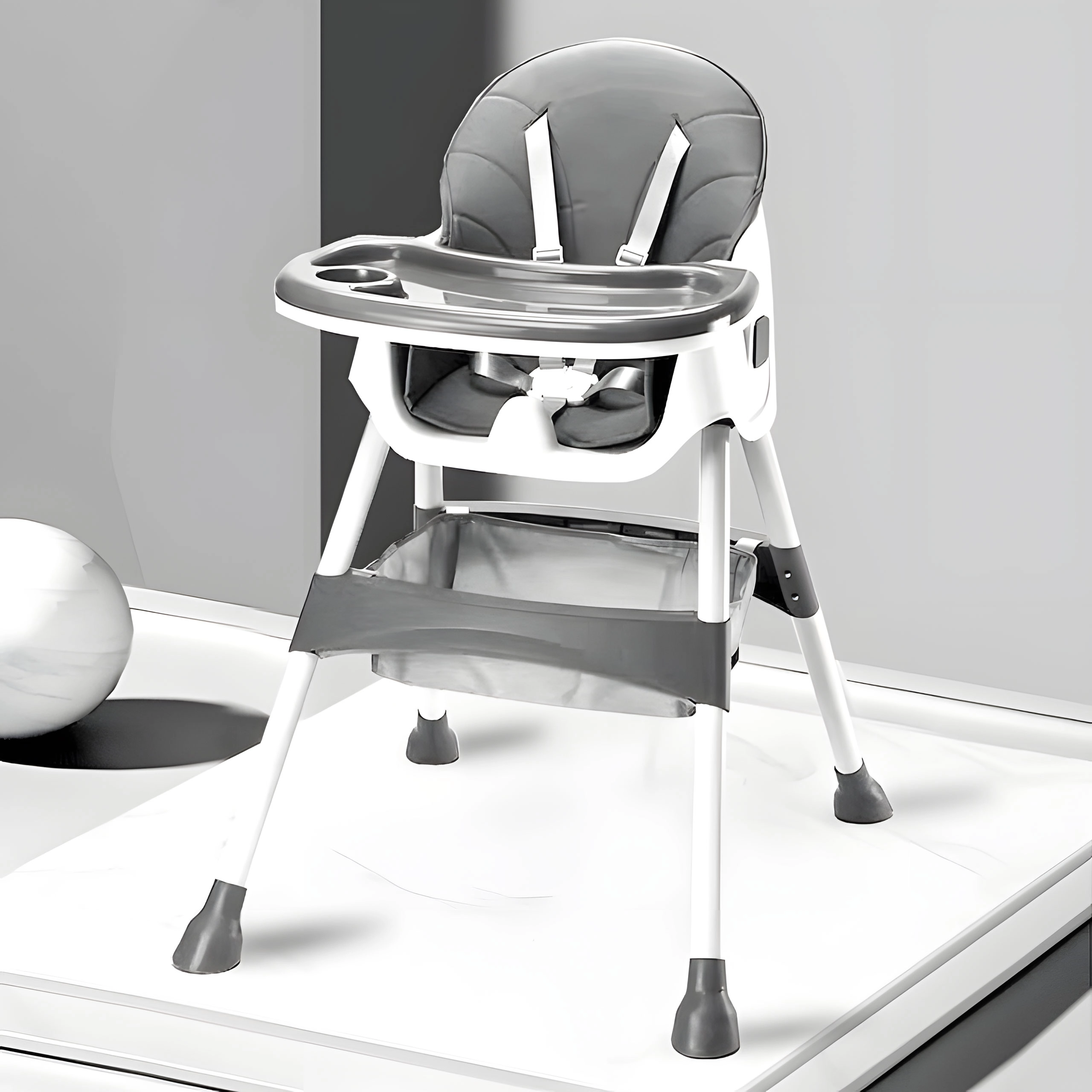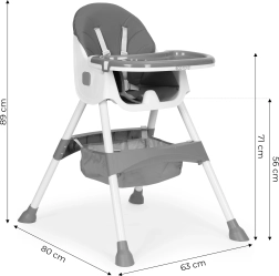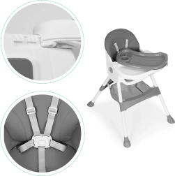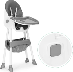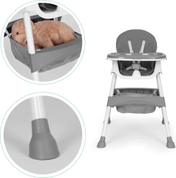 Την ασφάλεια εξασφαλίζουν η ζώνη 5 σημείων και τα σταθερά μεταλλικά πόδια με αντιολισθητικά τελειώματα. Ο διπλός αποσπώμενος δίσκος έχει υπερυψωμένα χείλη και θήκη ποτηριού, ενώ το επάνω μέρος πλένεται στο πλυντήριο. Η πτυσσόμενη κατασκευή εξοικονομεί χώρο και το καλαθάκι κάτω από το κάθισμα κρατά σαλιάρες, μωρομάντηλα και παιχνίδια πάντα πρόχειρα.