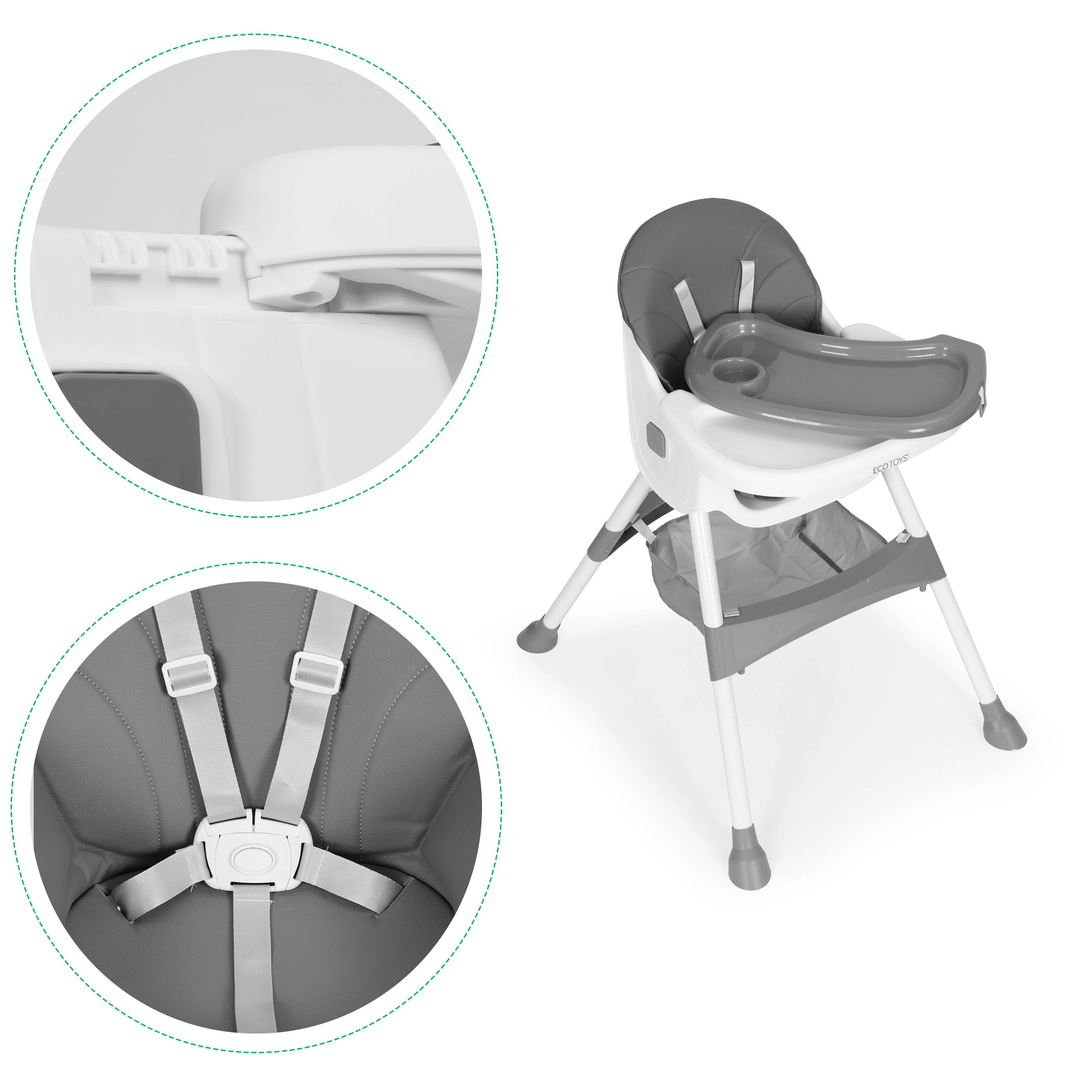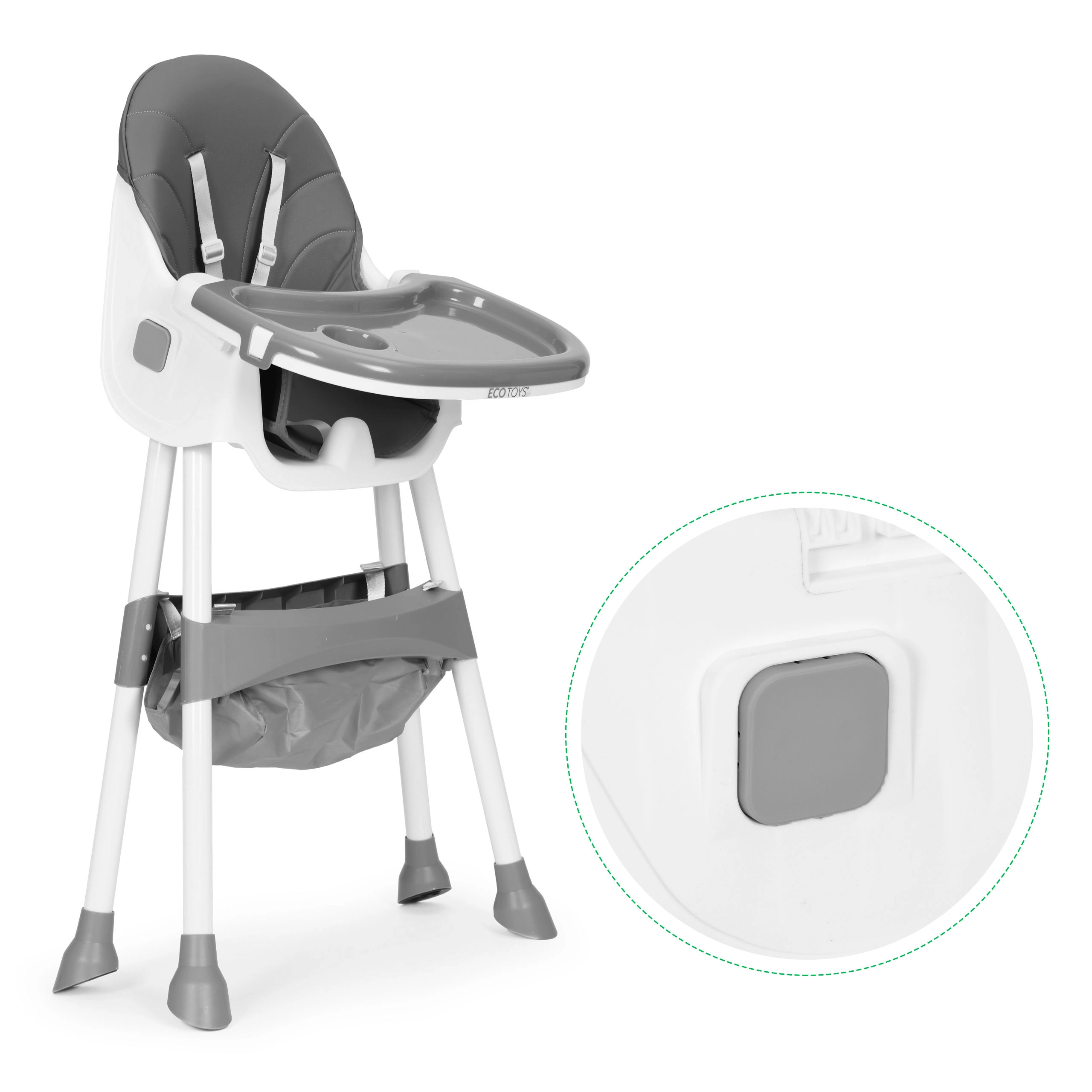 Το καρεκλάκι φαγητού ECOTOYS διευκολύνει το κοινό γεύμα και τα πρώτα ταΐσματα. Χάρη στον φαρδύ δίσκο με ρύθμιση σε 3 θέσεις, το παιδί τρώει άνετα και παίζει – χτίζει τουβλάκια ή ζωγραφίζει. Το κάθισμα με ανθεκτική επένδυση από οικολογικό δέρμα καθαρίζεται με ένα πέρασμα, για γρήγορη και χωρίς κόπο συντήρηση.