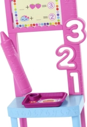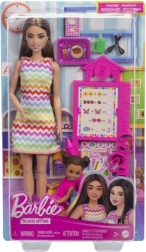 Το σετ περιλαμβάνει κούκλα Barbie ντυμένη με πολύχρωμο φόρεμα με ζιγκ-ζαγκ μοτίβο, που αναδεικνύει τη δημιουργικότητά της. Χάρη στα αξεσουάρ, όπως η βάση δασκάλας με αριθμούς και πίνακα, τα παιδιά μπορούν να βυθιστούν πλήρως στον ρόλο της δασκάλας.