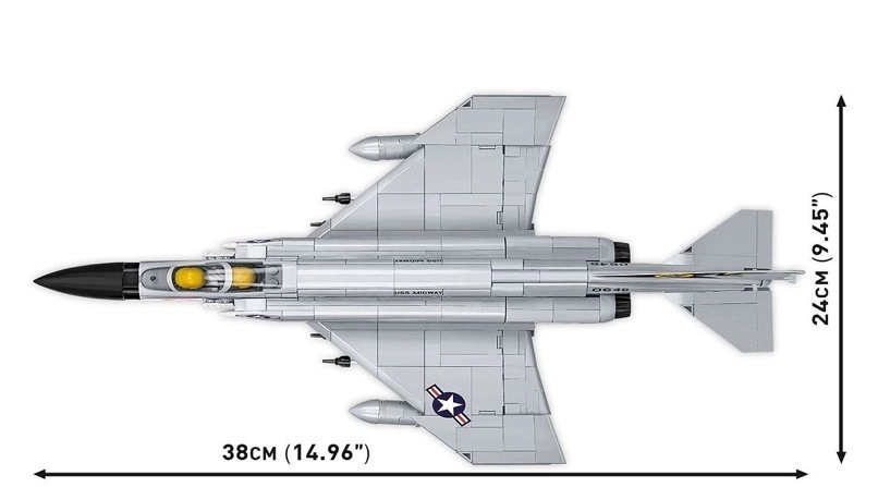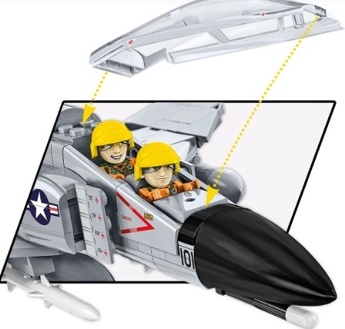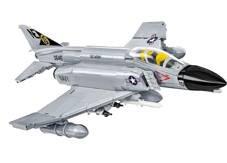 Το F-4 Phantom II είναι υπερηχητικό πολυλειτουργικό μαχητικό που υπηρέτησε στην Πολεμική Αεροπορία των ΗΠΑ από τη δεκαετία του ’60. Χρησιμοποιήθηκε σε αναχαιτιστικές, βομβαρδιστικές και αναγνωριστικές αποστολές, για παράδειγμα κατά τον Πόλεμο του Βιετνάμ. Το μοντέλο από 703 κομμάτια COBI αναπαράγει το αεροσκάφος πάνω στο αεροπλανοφόρο USS Midway, το οποίο μπορεί να επισκεφθεί κανείς στο Σαν Ντιέγκο (ΗΠΑ). Χάρη στην επίσημη άδεια, το μοντέλο είναι λεπτομερές σύμφωνα με το πραγματικό αεροσκάφος, με κινούμενα πηδάλια και αφαιρούμενο σύστημα προσγείωσης και οπλισμό. Το ανοιγόμενο πιλοτήριο προσφέρει χώρο για συμβολικές φιγούρες πιλότων. Το σετ περιλαμβάνει επίσης βάση έκθεσης και πλακέτα με το όνομα και την κλίμακα του αεροσκάφους 1:48.