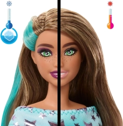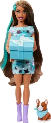 BARBIE με μακριά μαλλιά και τιρκουάζ ανταύγειες, λαμπερό φόρεμα με μοβ αστέρια και στιλάτα παπούτσια. Περιλαμβάνεται και αξιαγάπητο σκυλάκι με μαντηλάκι.