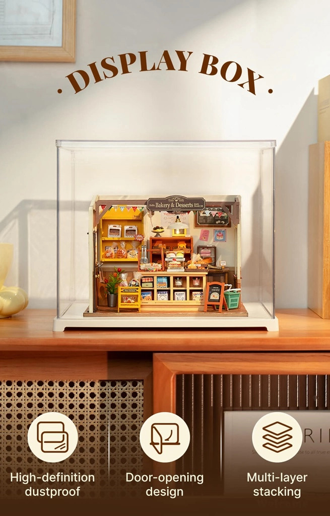Ιδανική βιτρίνα για μινιατούρες σπιτιών της σειράς DG (εκτός από το DG12). Διατηρεί τη σκηνή χωρίς σκόνη και την παρουσιάζει όμορφα – από καφετέρια και αρτοποιείο έως θερμοκήπιο ή μικρή κουζίνα.
