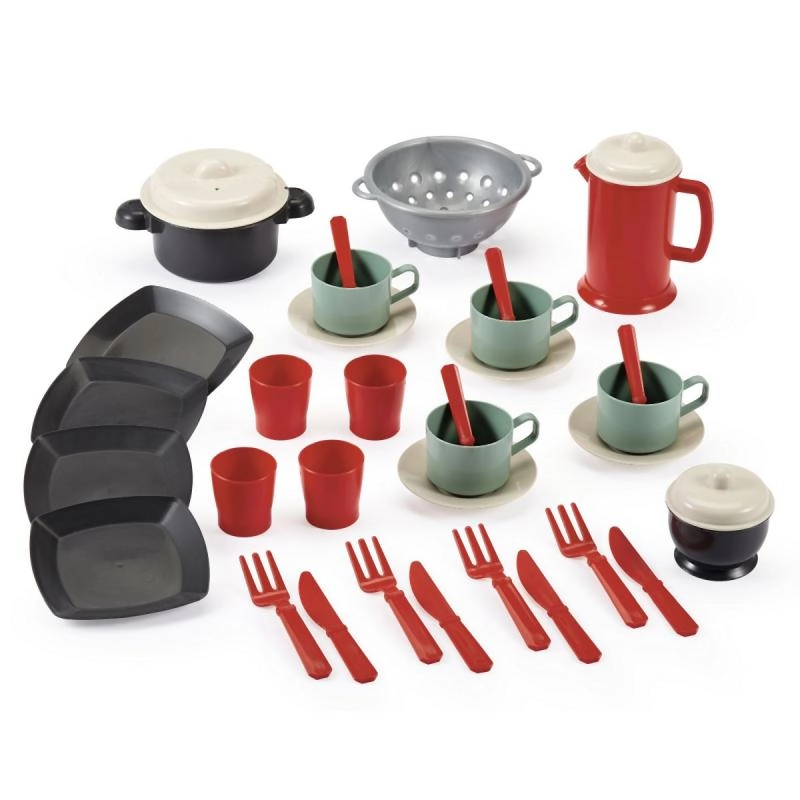 Μεγάλη διαφανής τσάντα με τέσσερα πιάτα, μαχαιροπίρουνα, ποτηράκια, φλυτζανάκια με πιατάκια, τσαγιερό, ζαχαριέρα, σουρωτήρι και κατσαρόλα με καπάκι. Υπέροχο παιδικό σετ για διασκεδαστικό παιχνίδι.