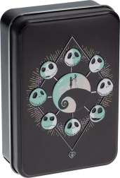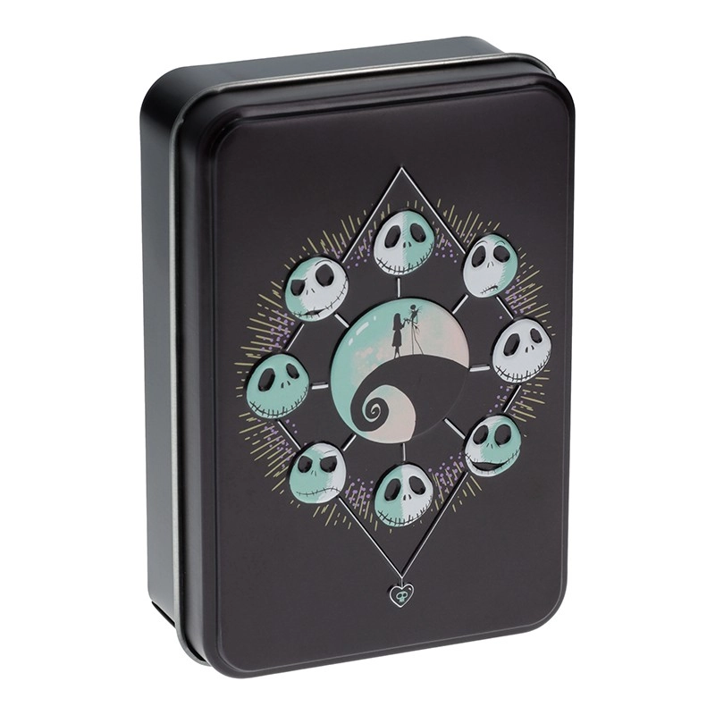 Μαύρο μεταλλικό κουτί με τον Τζακ Σκέλινγκτον και τη Σάλι, ιδανικό για αποθήκευση και προστασία της τράπουλας.
