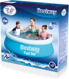 Η φουσκωτή πισίνα Bestway Fast Set με διάμετρο 183 cm και ύψος 51 cm είναι μια πρακτική και οικονομική λύση για οικιακή χρήση. Είναι κατασκευασμένη από ανθεκτικό υλικό DuraPlus™, που εξασφαλίζει αντοχή, προστασία από την υπεριώδη ακτινοβολία και μηχανικές φθορές. Στήνεται εύκολα σε γρασίδι ή σε σκληρή, επίπεδη επιφάνεια.
