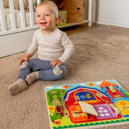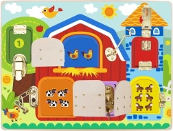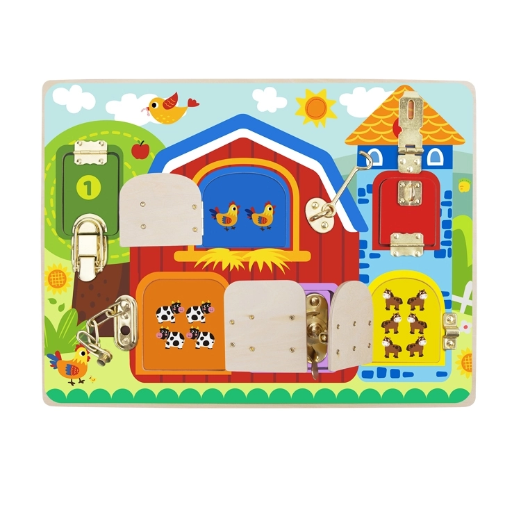 Αυτός ο ποιοτικός ξύλινος πίνακας προσφέρει 6 παραθυράκια με μεντεσέδες με διαφορετικούς μηχανισμούς – από κλασικούς σύρτες μέχρι αλυσίδες και γάντζους. Τα παιδιά εξασκούν τα δάχτυλα, τη συγκέντρωση και την υπομονή τους ανοίγοντας και κλείνοντας τις κλειδαριές για να ανακαλύψουν χαριτωμένες εικόνες ζώων.