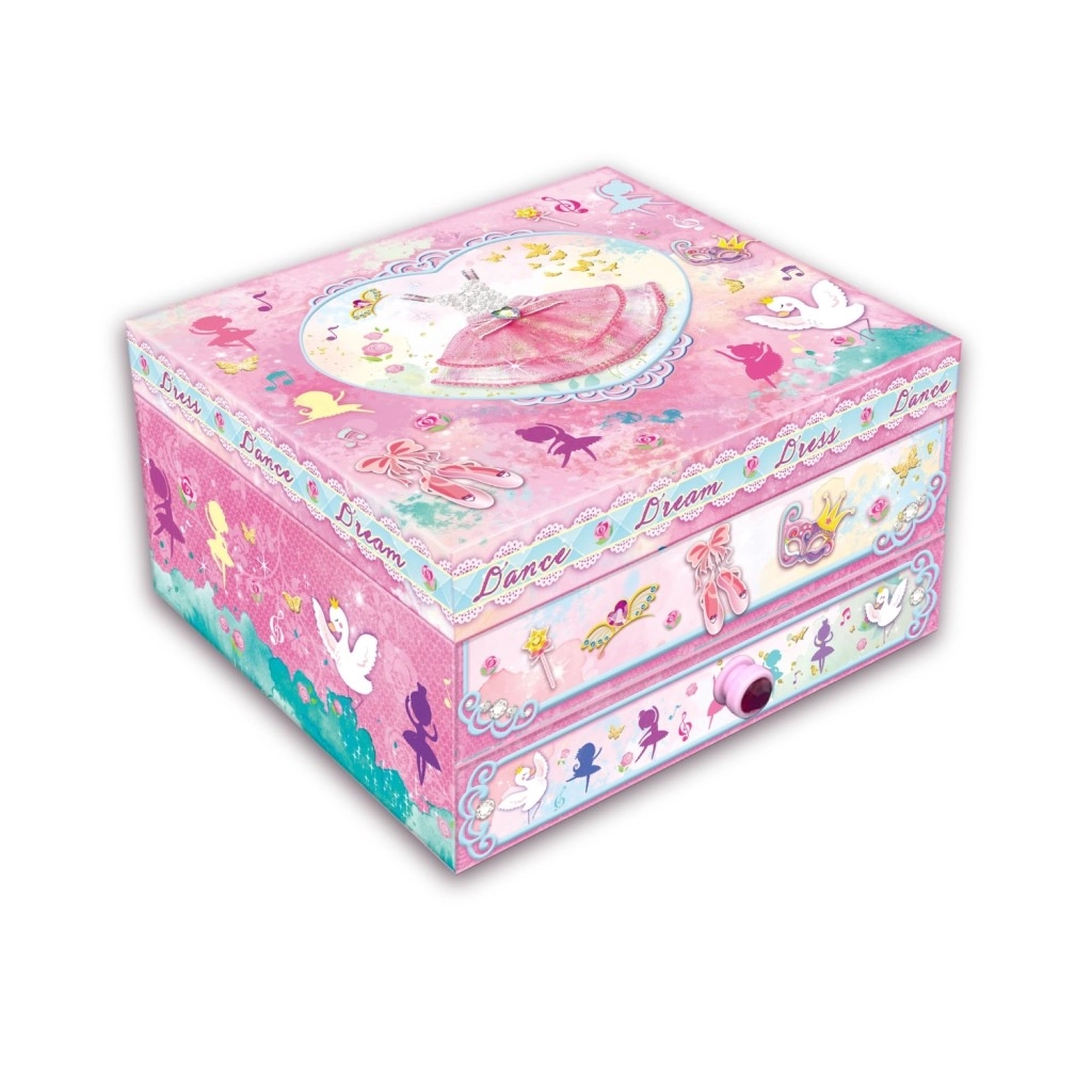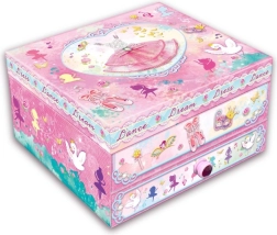 Ένα κομψό μουσικό κουτί κοσμημάτων με θέμα μπαλαρίνας που διατηρεί τα πολύτιμά σας αντικείμενα ασφαλή και τακτοποιημένα. Με το κούρδισμα και άνοιγμα αρχίζει να παίζει μια μελωδία που θα χαροποιήσει κάθε μικρή καλοντυμένη. Κατασκευασμένο από σταθερό και ανθεκτικό χαρτόνι με λεία επιφανειακή επεξεργασία. Ιδανικό δώρο για κορίτσια από 6 ετών.