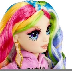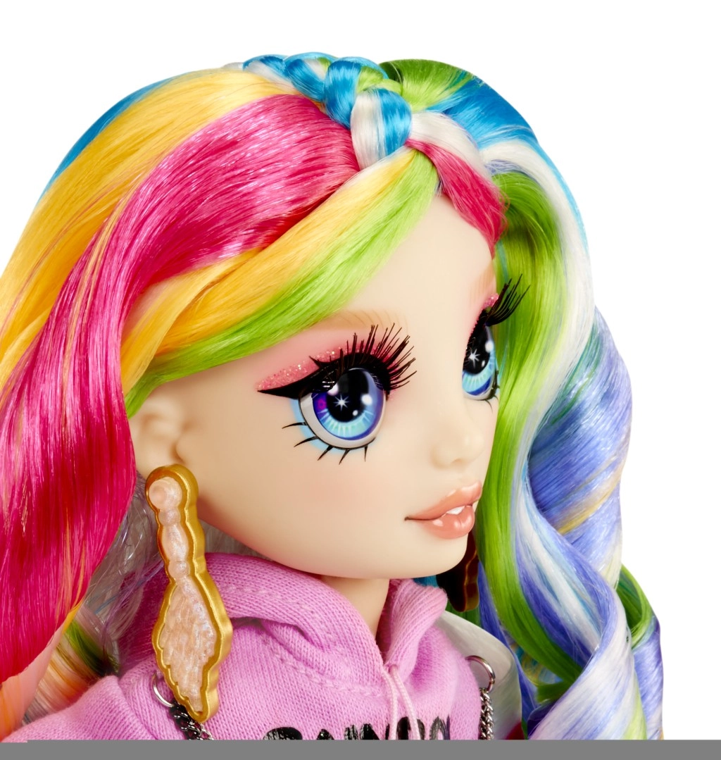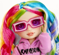Η Amaya Raine εντυπωσιάζει με έντονα, πολύχρωμα μαλλιά, φούτερ με το λογότυπο RAINBOW και λαμπερή φούστα. Χάρη στις αρθρωτές αρθρώσεις ποζάρει υπέροχα και διασκεδάζει.