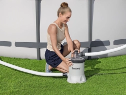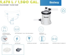 Ισχυρή αντλία πισίνας BESTWAY με παροχή 5678 l/h για κρυστάλλινα καθαρό νερό. Χρησιμοποιεί σφαιρίδια φίλτρανσης Polysphere, που εξασφαλίζουν πολυβάθμια φίλτρανση, μεγαλύτερη διάρκεια ζωής και εύκολη συντήρηση. Ιδανική για υπέργειες πισίνες όγκου 1 100–31 700 l.