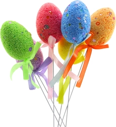 Δημιουργήστε χαρούμενη ανοιξιάτικη διακόσμηση σε ελάχιστο χρόνο. Το σετ περιλαμβάνει 6 διακοσμητικά αυγουλάκια σε καλαμάκι σε διάφορα χρώματα, που αναδεικνύονται όμορφα σε βάζο με κλαδάκια, σε γλάστρα ή σε ψάθινες συνθέσεις. Ελαφρύ πολυστυρένιο με επιφάνεια καλυμμένη με μπιλίτσες και μικρά μοτίβα προσφέρει παιχνιδιάρικη αλλά και κομψή εμφάνιση ταυτόχρονα.
