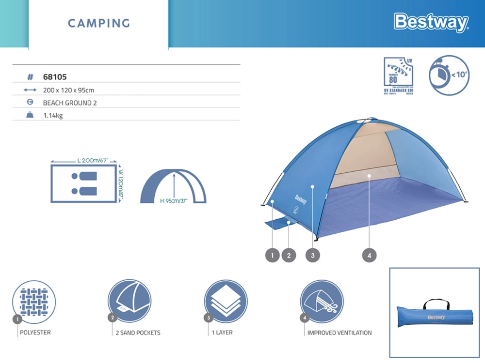 Η παραλιακή σκηνή Bestway Beach Ground 2 έχει σχεδιαστεί για όσους θέλουν να απολαύσουν την ημέρα στην παραλία χωρίς την έντονη ηλιακή ακτινοβολία. Προσφέρει μια απλή λύση που παρέχει σκιά κατά τη διάρκεια των ζεστών καλοκαιρινών ημερών και κατάλληλο αποθηκευτικό χώρο για όλα τα αξεσουάρ παραλίας.