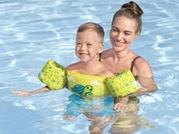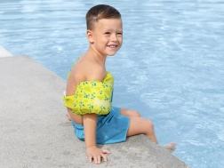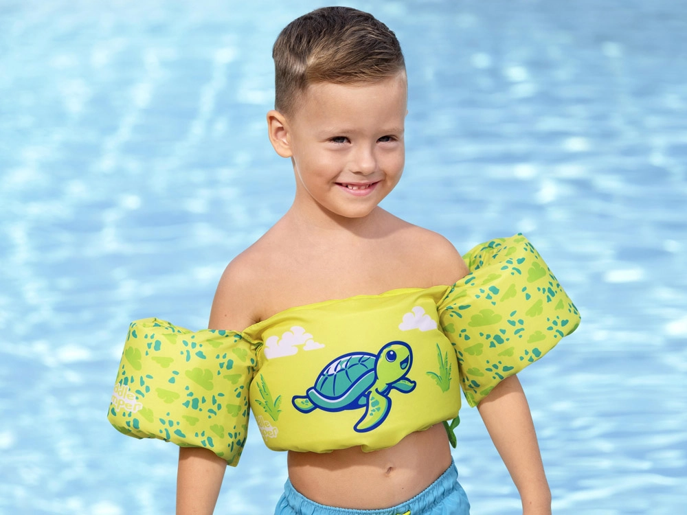 Αναζητάτε ένα αξιόπιστο βοήθημα για τα πρώτα βήματα στην κολύμβηση; Το BESTWAY Puddle Jumper συνδυάζει σωσίβιο γιλέκο και μανίκια σε ένα ενιαίο προϊόν που βοηθά το παιδί να διατηρεί σωστή θέση στο νερό χωρίς να περιορίζει την κίνηση. Το χαρούμενο μοτίβο χελώνας και τα ζωντανά καλοκαιρινά χρώματα παρακινούν τα παιδιά στη δραστηριότητα και αυξάνουν την ορατότητα στο νερό.