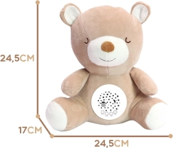 Το αρκουδάκι είναι φτιαγμένο από λεπτό, απαλό υλικό και γεμισμένο με βάτα για μέγιστη απαλότητα. Χάρη στον αποσπώμενο μηχανισμό, το λούτρινο πλένεται εύκολα και το παιδί μπορεί να το απολαμβάνει και ως κλασικό αγκαλίτσα παιχνίδι. Τα 3 επίπεδα έντασης επιτρέπουν να προσαρμόσετε τον ήχο ακριβώς στις ανάγκες του μωρού σας.