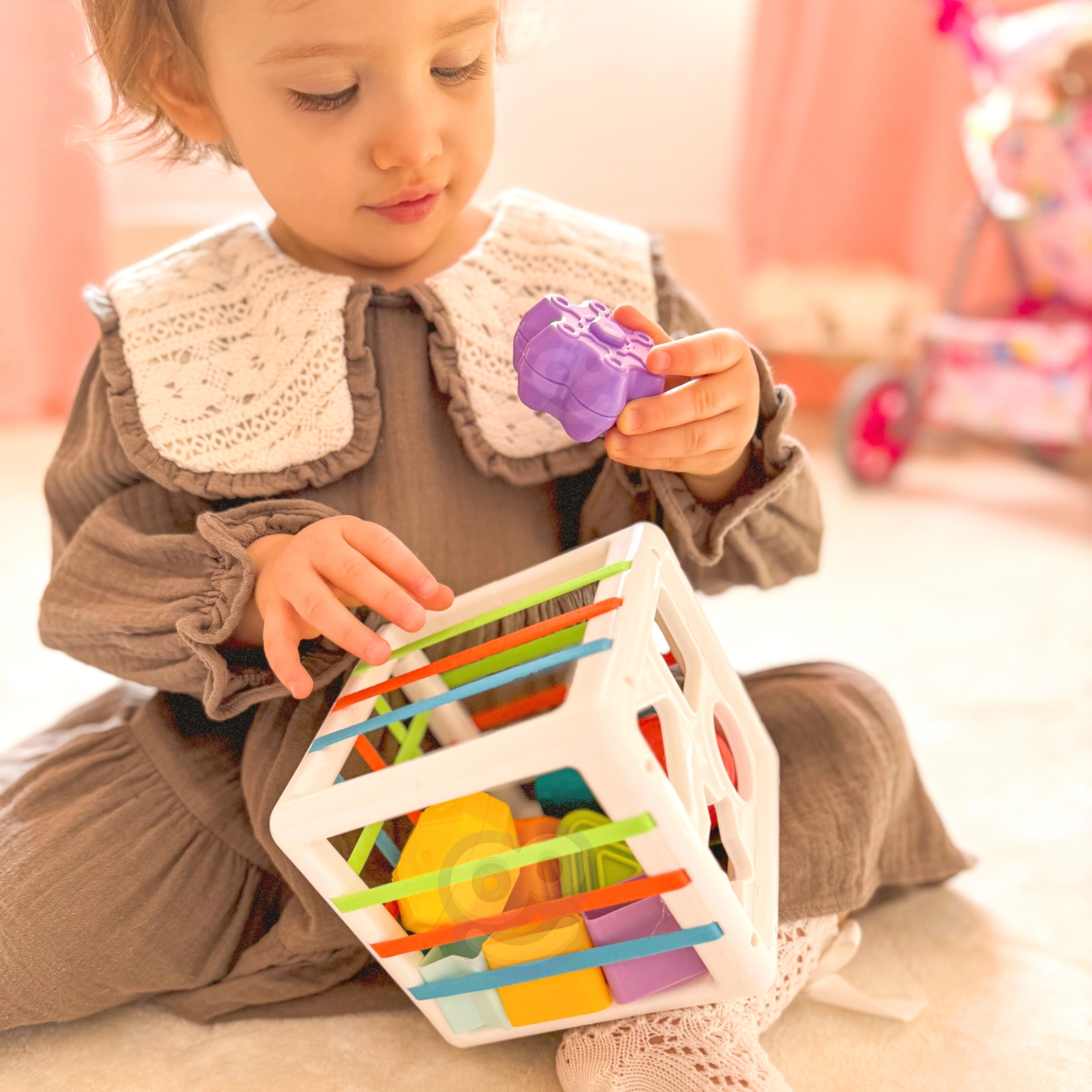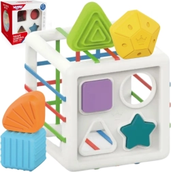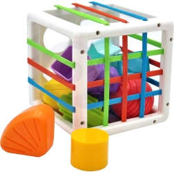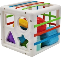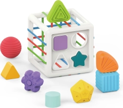 Αυτός ο πολύχρωμος αισθητηριακός κύβος συνδυάζει δύο αγαπημένες δραστηριότητες: την εισαγωγή κομματιών μέσω ελαστικών λουριών και την ταξινόμηση σε οπές σχημάτων. Τα παιδιά μαθαίνουν να αναγνωρίζουν χρώματα και γεωμετρικά σχήματα, καλλιεργούν την περιέργεια και την ικανότητα συγκέντρωσης. Τα στιβαρά κομμάτια πιάνονται εύκολα και ο κύβος έχει πρακτική κατασκευή για άνετη μεταφορά και τακτοποίηση.
