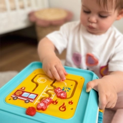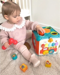 Κουμπιά, τροχίσκοι, σχήματα και σφυράκι παρακινούν τα παιδιά να πιάνουν και να κινούνται με ακρίβεια. Αναπτύσσουν τον συντονισμό χεριού–ματιού και την αισθητηριακή αντίληψη.