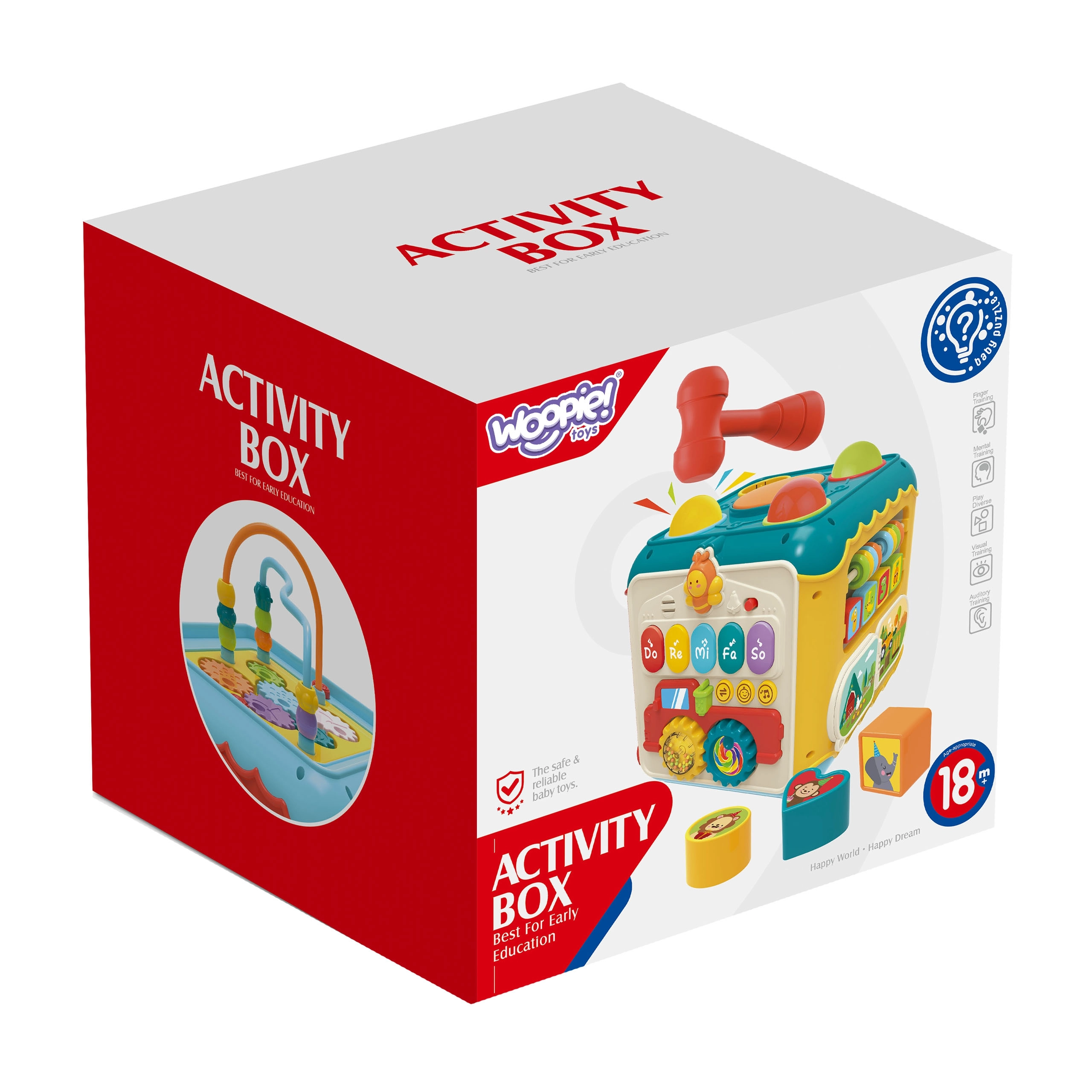 Πολυλειτουργικός ενεργός κύβος 6 σε 1 από τη μάρκα WOOPIE προσφέρει στα μικρά παιδιά ποικιλία διασκέδασης και μάθησης μαζί. Κάθε πλευρά προσφέρει διαφορετική δραστηριότητα – πιάνο με ήχους, χτύπημα μπαλών με σφυράκι, λαβύρινθο, ταξινόμηση σχημάτων με πορτάκι και κλειδαριά, περαστήρι και ρολόι με κουδουνίστρα. Το παιχνίδι αναπτύσσει τη λεπτή κινητικότητα, τον συντονισμό χεριού–ματιού, την αναγνώριση χρωμάτων, σχημάτων και ήχων και ενισχύει τη περιέργεια και τη δημιουργικότητα. Οι συμπαγείς διαστάσεις εξασφαλίζουν εύκολη μεταφορά και ατελείωτη διασκέδαση στο ταξίδι και στο σπίτι.