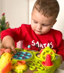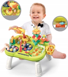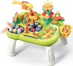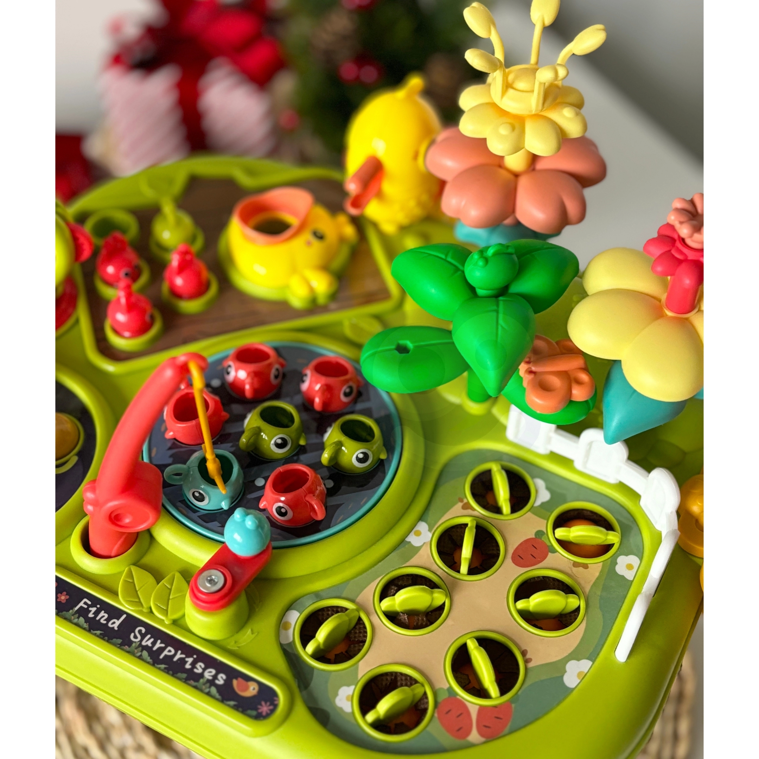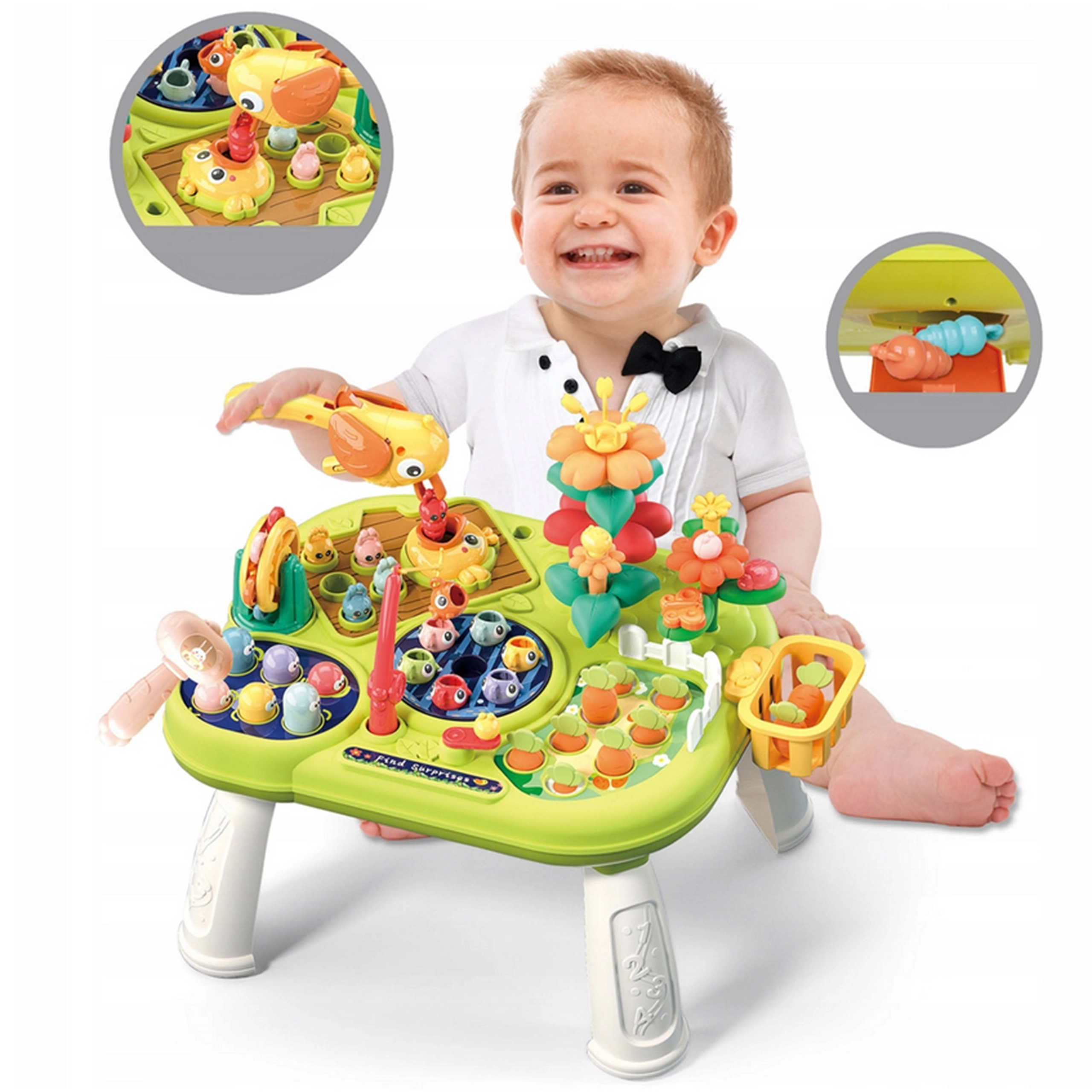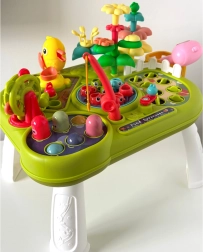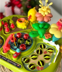 Τι περιμένει τα παιδιά; Ψάρεμα ψαριών με καλάμι, χτύπημα σκουληκιών με σφυράκι, ταξινόμηση και συναρμολόγηση λουλουδιών, συγκομιδή καροτιών, τάισμα του πουλιού, περιστρεφόμενος μύλος, πρακτικό καλαθάκι για κομμάτια και κρυψώνα για σκουλήκια. Κάθε δραστηριότητα αναπτύσσει διαφορετική δεξιότητα και κρατά την προσοχή των παιδιών χωρίς περιττούς περισπασμούς.