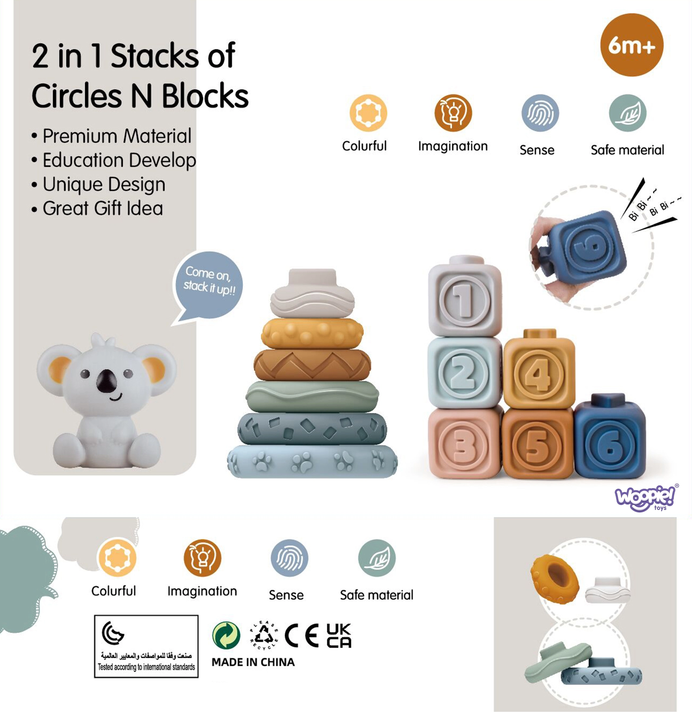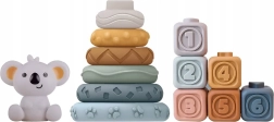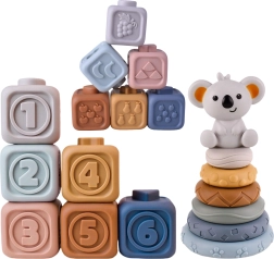 Αυτό το πολυλειτουργικό εκπαιδευτικό παιχνίδι 3-σε-1 από τη WOOPIE περιλαμβάνει έξι δαχτυλίδια στοίβαξης που καταλήγουν σε μια χαριτωμένη φιγούρα κοάλα και έξι μαλακά σιλικονούχα τουβλάκια με ανάγλυκους αριθμούς και εικόνες. Χάρη στην ευχάριστη, εύκαμπτη υφή, εφαρμόζουν άψογα στο παιδικό χεράκι και λειτουργούν ταυτόχρονα ως ασφαλές μασητικό. Το σετ είναι ιδανικό για καθημερινό παιχνίδι στο σπίτι και στο μπάνιο.