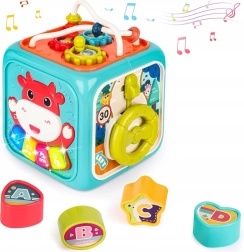 Εκτός από τις μουσικές λειτουργίες, ο κύβος περιλαμβάνει κουμπωτά σχήματα με 4 μορφές και γραμματάκια, περιστρεφόμενο ρολόι, γρανάζια, τιμόνι με αυτοκινητάκι και λαβύρινθο με μπίλιες. Το στιβαρό πλαστικό, οι στρογγυλεμένες άκρες και τα μη τοξικά χρώματα εξασφαλίζουν ασφαλές παιχνίδι από τους πρώτους μήνες. Τροφοδοσία με 3× AA (δεν περιλαμβάνονται).