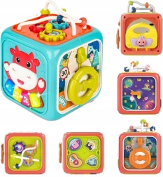 Τέσσερις πολύχρωμοι κύβοι με σχήματα και γράμματα εξασκούν το πιάσιμο και την ταξινόμηση. Τα γρανάζια, ο λαβύρινθος με δαχτυλίδια και το περιστρεφόμενο ρολόι ενισχύουν τον συντονισμό χεριού–ματιού και τη λογική σκέψη.