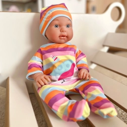 Στιλάτο σετ ρούχων με μοτίβο μονόκερου που μεταμορφώνει κάθε κούκλα σε χαριτωμένο μωρό, έτοιμο για παιχνίδι και αγκαλιές. Τα πολύχρωμα ριγέ σχέδια και το ταιριαστό σκουφάκι εντυπωσιάζουν με την πρώτη ματιά, ενώ η άνετη γραμμή διευκολύνει το ντύσιμο ακόμη και για μικρότερα παιδιά. Εξαιρετική επιλογή για δώρο – η συσκευασία διαθέτει πρακτικό κρεμαστάρι για εύκολη μεταφορά.