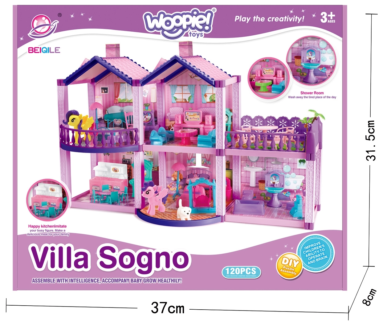 Μαγευτικό πλαστικό σπιτάκι για κούκλες από τη μάρκα WOOPIE, μια διώροφη βίλα με πλούσια αξεσουάρ και 120 κομμάτια για ατελείωτο δημιουργικό παιχνίδι. Το σετ περιλαμβάνει 2 πόνι, σκυλάκι, έπιπλα και διακοσμητικά. Περιλαμβάνονται σαλόνι, κουζίνα με τραπεζαρία, δύο υπνοδωμάτια, μπάνιο και μπαλκόνι. Ποιοτική κατασκευή, ασφαλή υλικά και ζωντανά χρώματα που θα ενθουσιάσουν κάθε παιδί από 3 ετών.