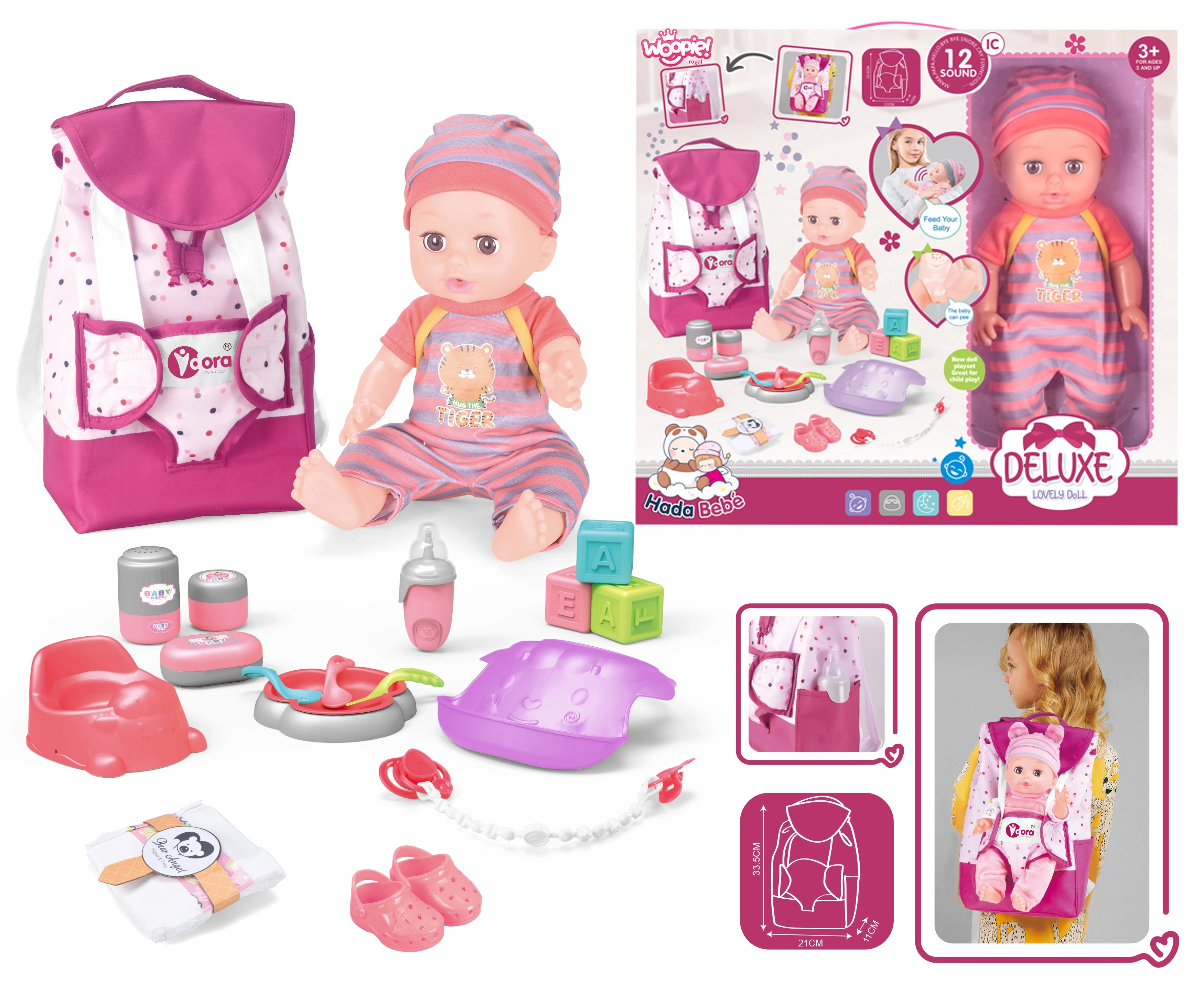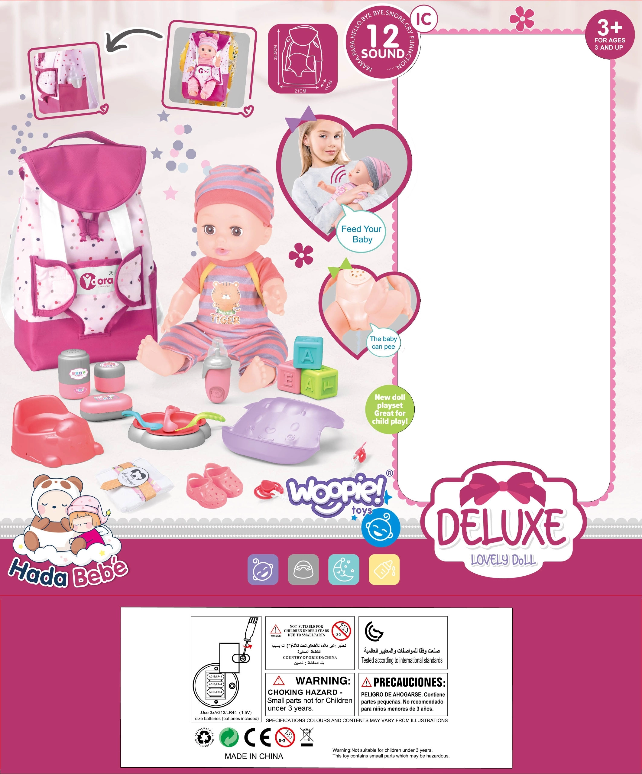 Η κούκλα επίσης παράγει 12 χαρακτηριστικούς ήχους όπως «μαμά», «μπαμπά», κλάμα, γέλιο, φτέρνισμα και μπουρμπουλήθρες, που θα χαροποιήσουν κάθε παιδί.