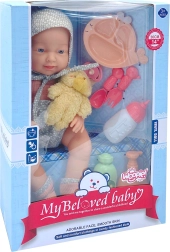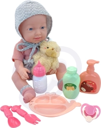 Το σετ περιλαμβάνει ό,τι χρειάζονται οι μικροί φροντιστές: ντυμένη κούκλα, πιπίλα, αρκουδάκι, μπουκαλάκι και σετ φαγητού (πιατάκι, πιρουνάκι, κουταλάκι), συμπληρωμένα με δύο μπουκάλια “καλλυντικών” για σενάρια μπάνιου και φροντίδας. Η κούκλα έχει μαλακά, λαστιχένια κινητά άκρα και πλαστικό σωματάκι χωρίς λούτρινη γέμιση.