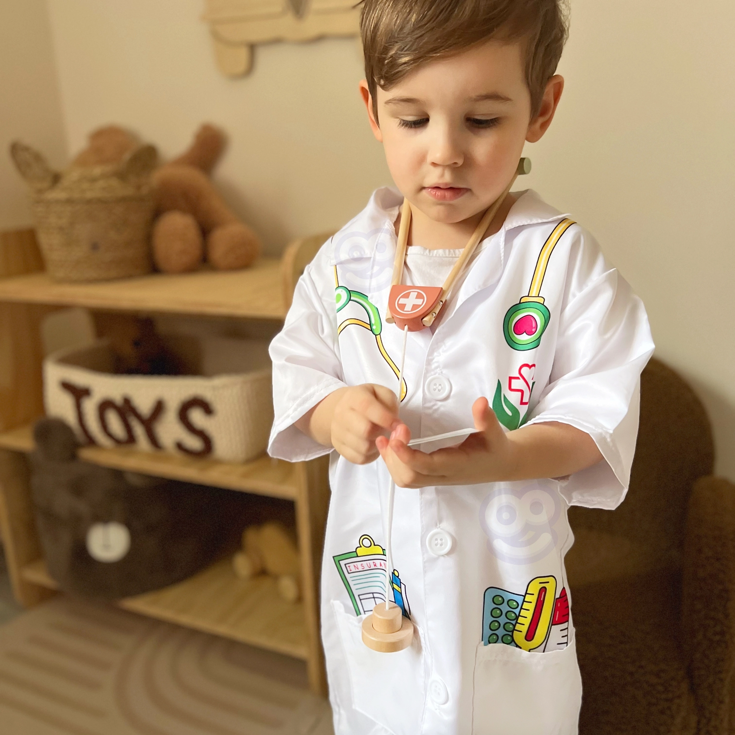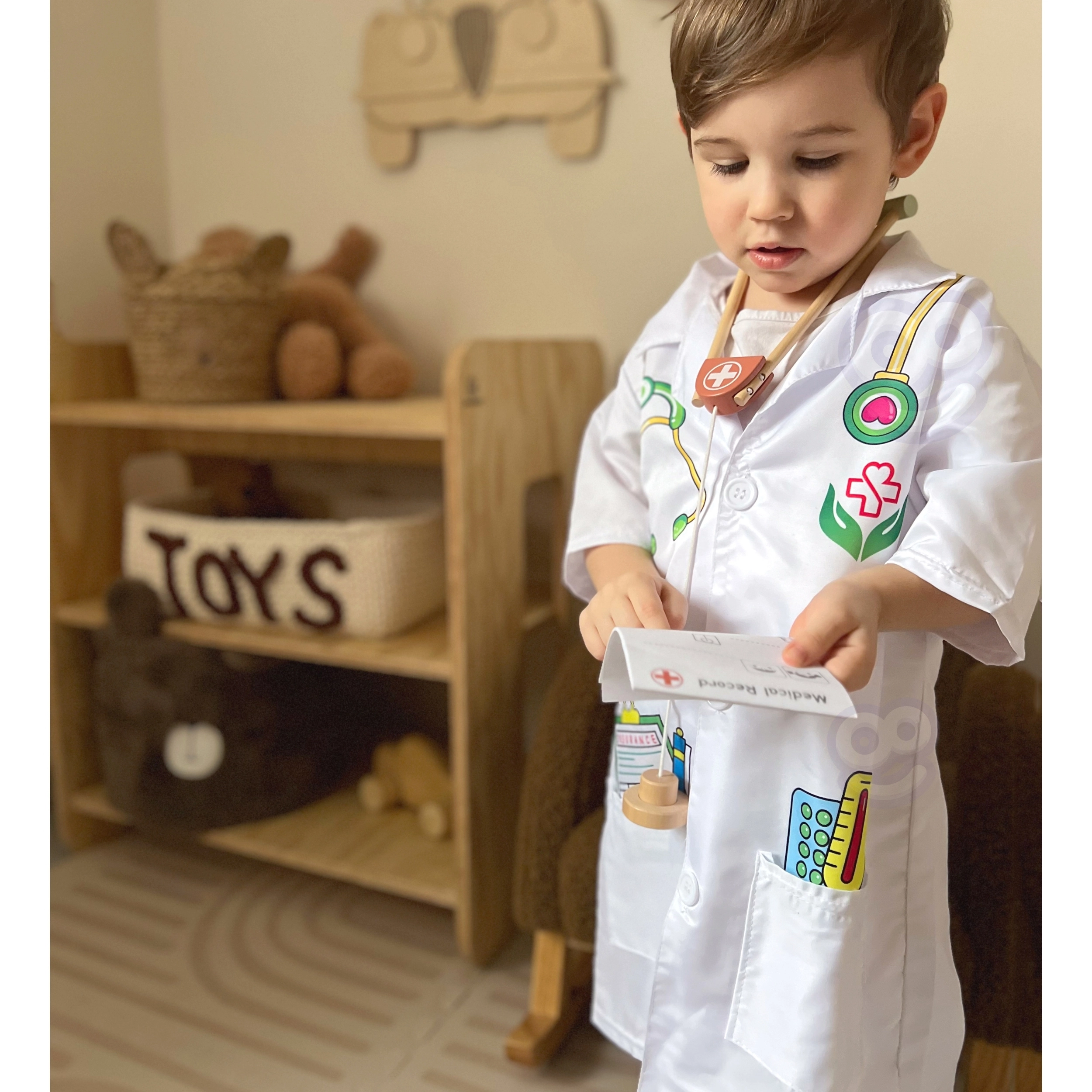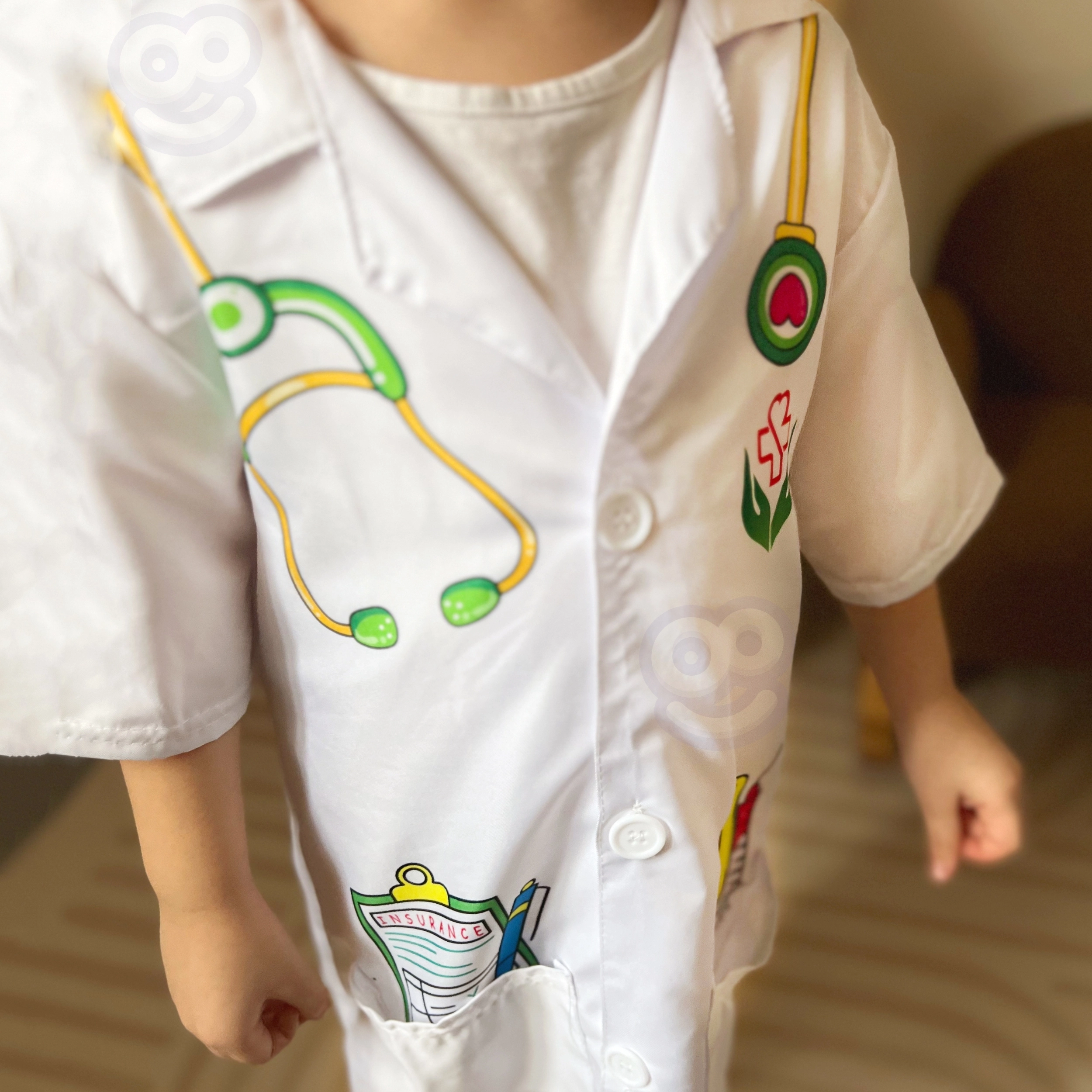 Αυτή η προσεκτικά κατασκευασμένη ιατρική στολή από τη Woopie προσφέρει στους μικρούς λάτρεις της ιατρικής τον ιδανικό εξοπλισμό για τα φανταστικά τους παιχνίδια. Περιλαμβάνει πολύχρωμες εκτυπώσεις εργαλείων όπως στηθοσκόπιο, φάρμακα και θερμόμετρο. Χάρη στις ευρύχωρες τσέπες, είναι ιδανική για την αποθήκευση επιπλέον παιχνιδιών.