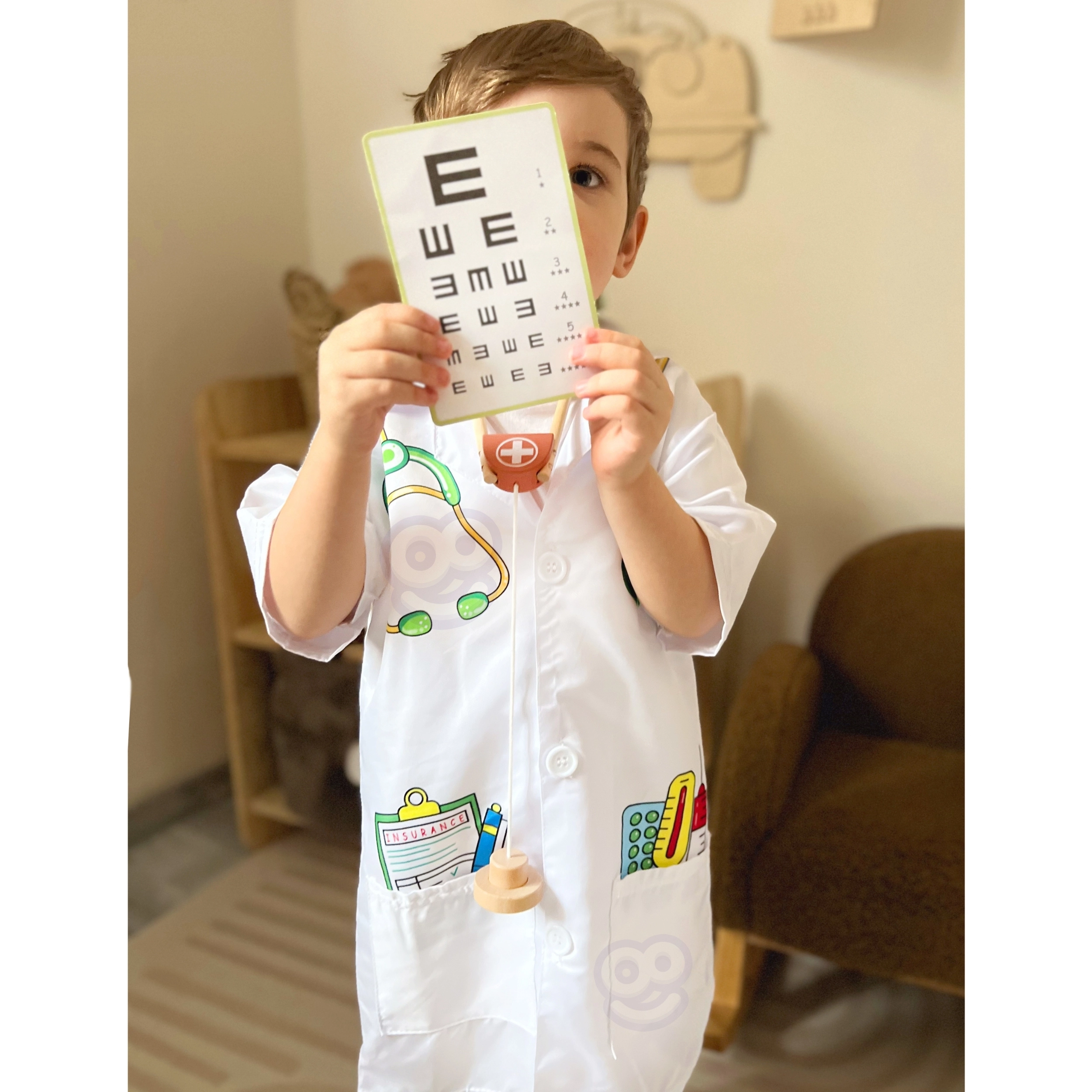 Περιλαμβάνει εκτυπώσεις από στηθοσκόπιο, φάρμακα και άλλα ιατρικά εργαλεία που ενθαρρύνουν τη δημιουργικότητα στο παιχνίδι.