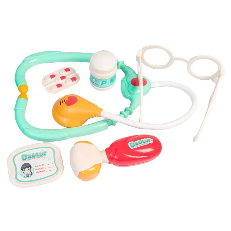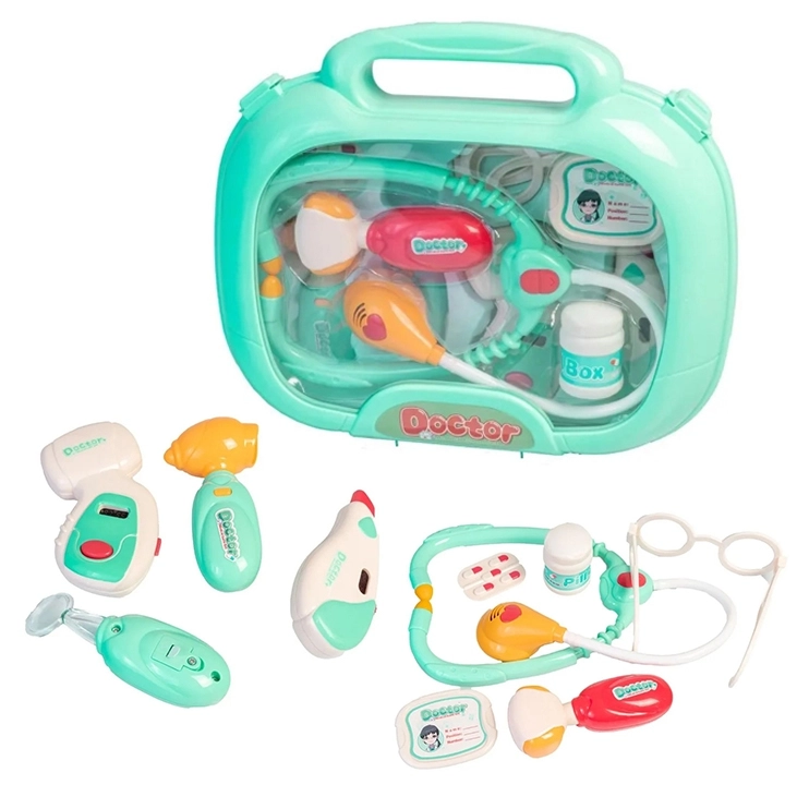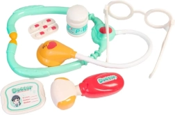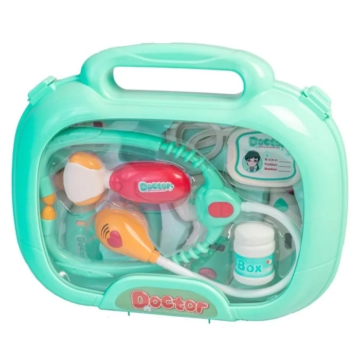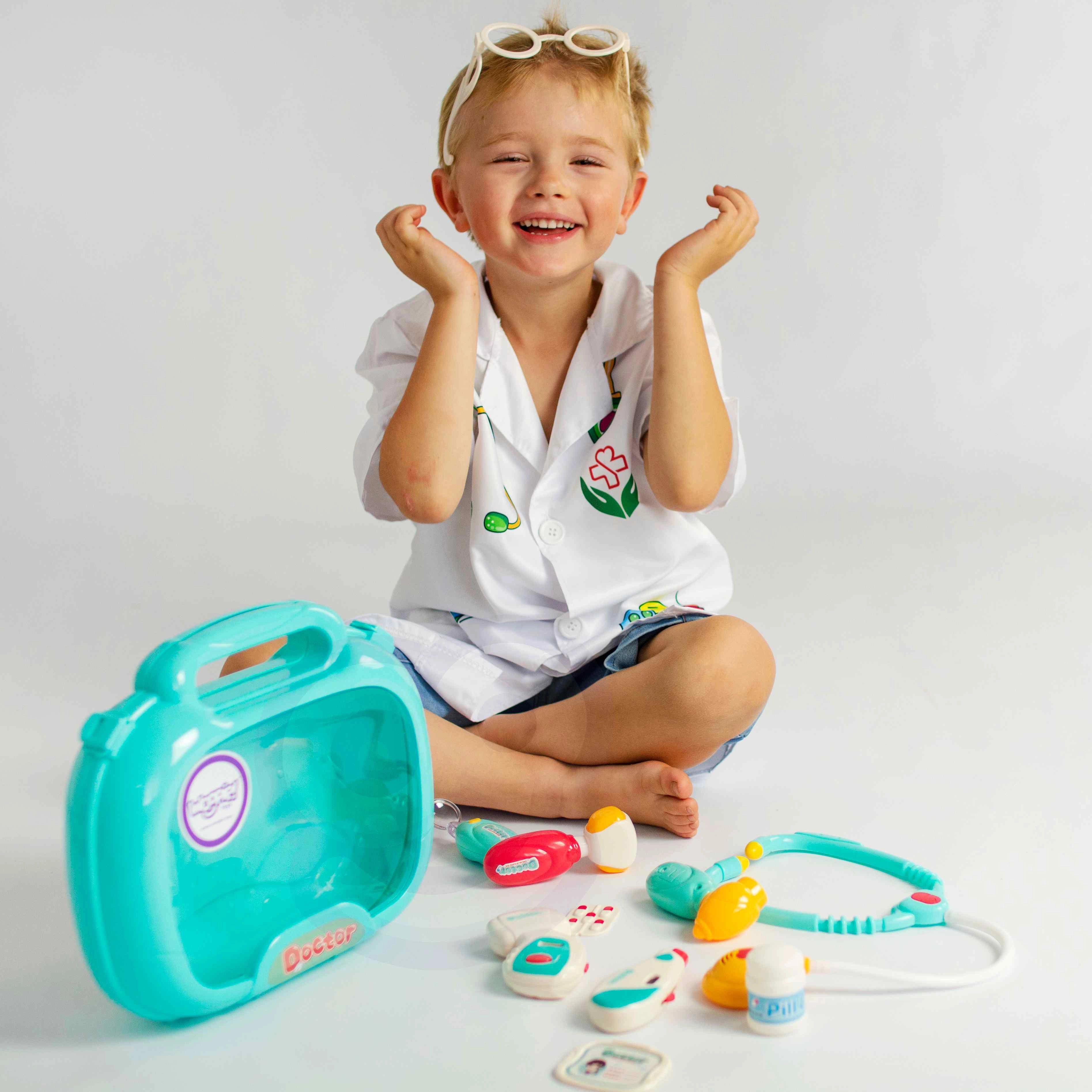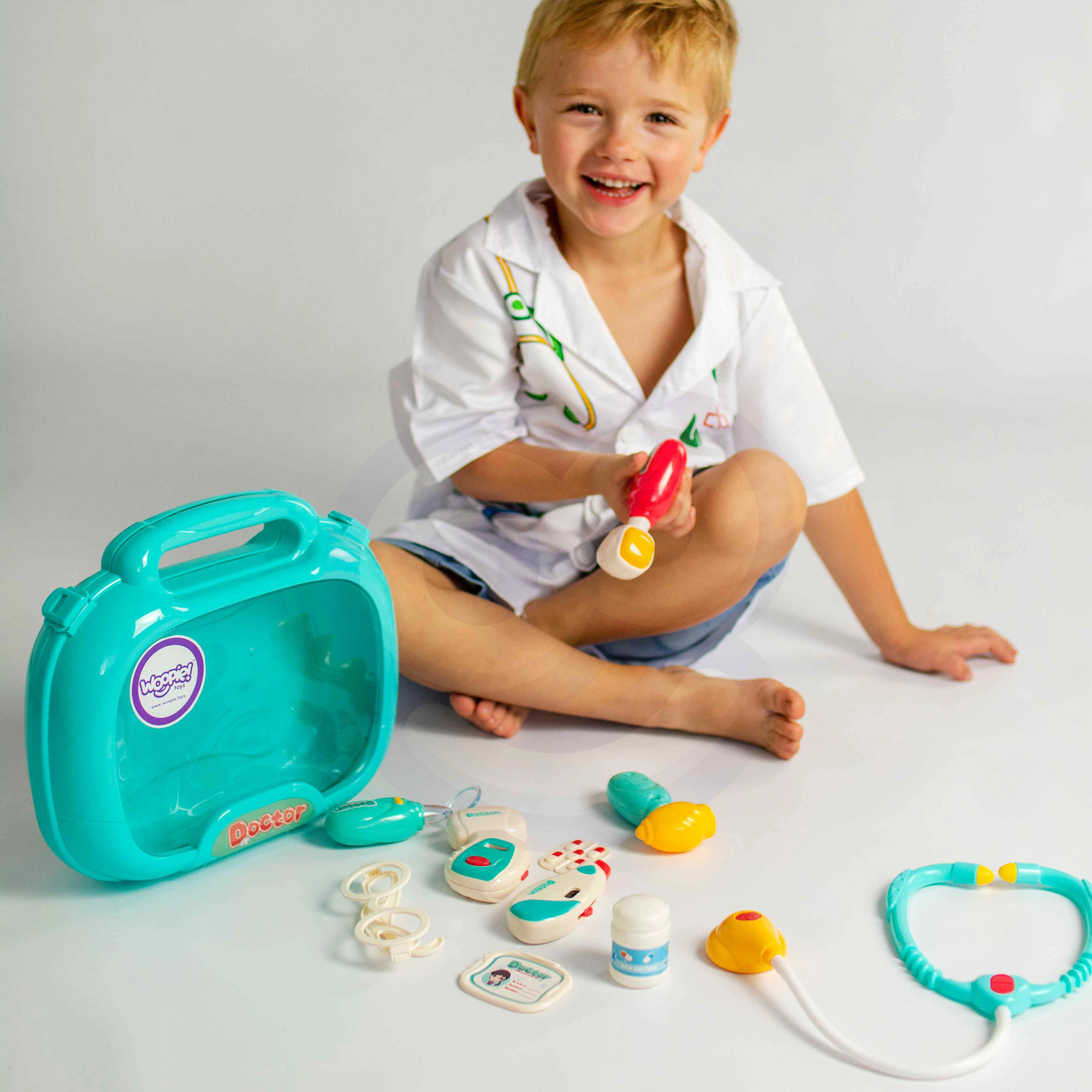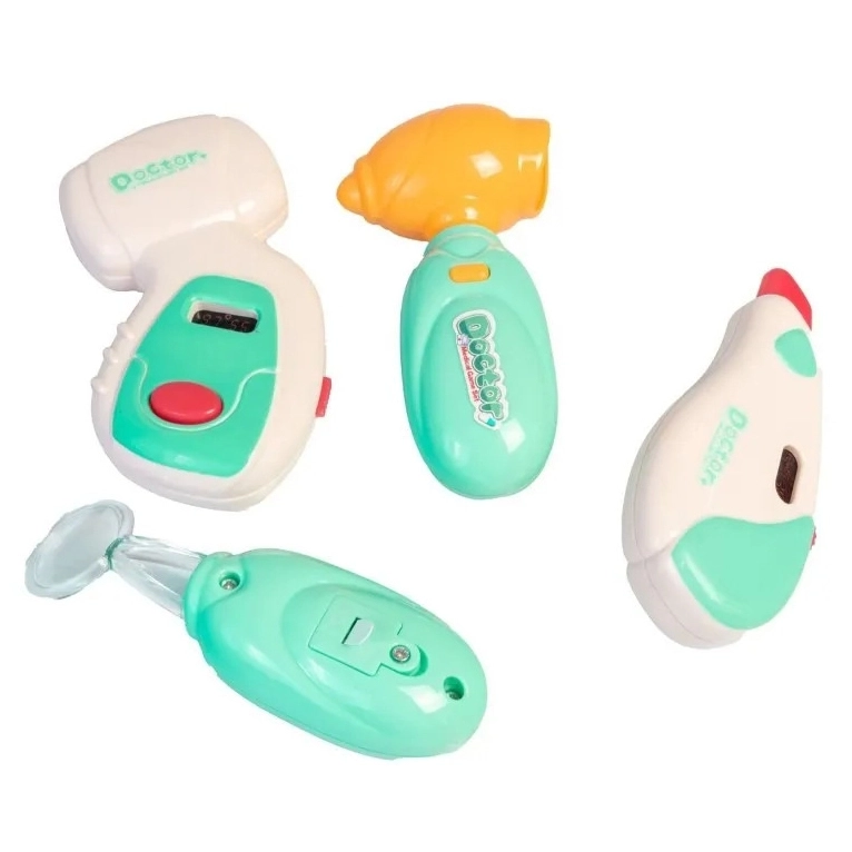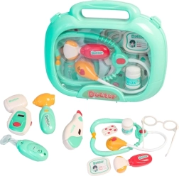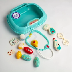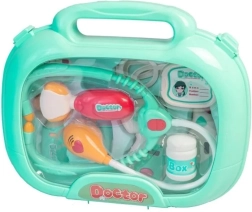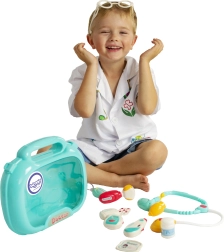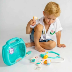 Όλα τα εργαλεία είναι ελαφριά, προσαρμοσμένα στα παιδικά χεράκια (περίπου 11–12 εκ.) και αποθηκευμένα με ασφάλεια σε μια ανθεκτική πλαστική βαλιτσέτα σε τιρκουάζ και κόκκινες αποχρώσεις. Το σετ αναπτύσσει τη λεπτή κινητικότητα, την επικοινωνία και τις κοινωνικές δεξιότητες μέσα από το παιχνίδι γιατρού και ασθενούς.