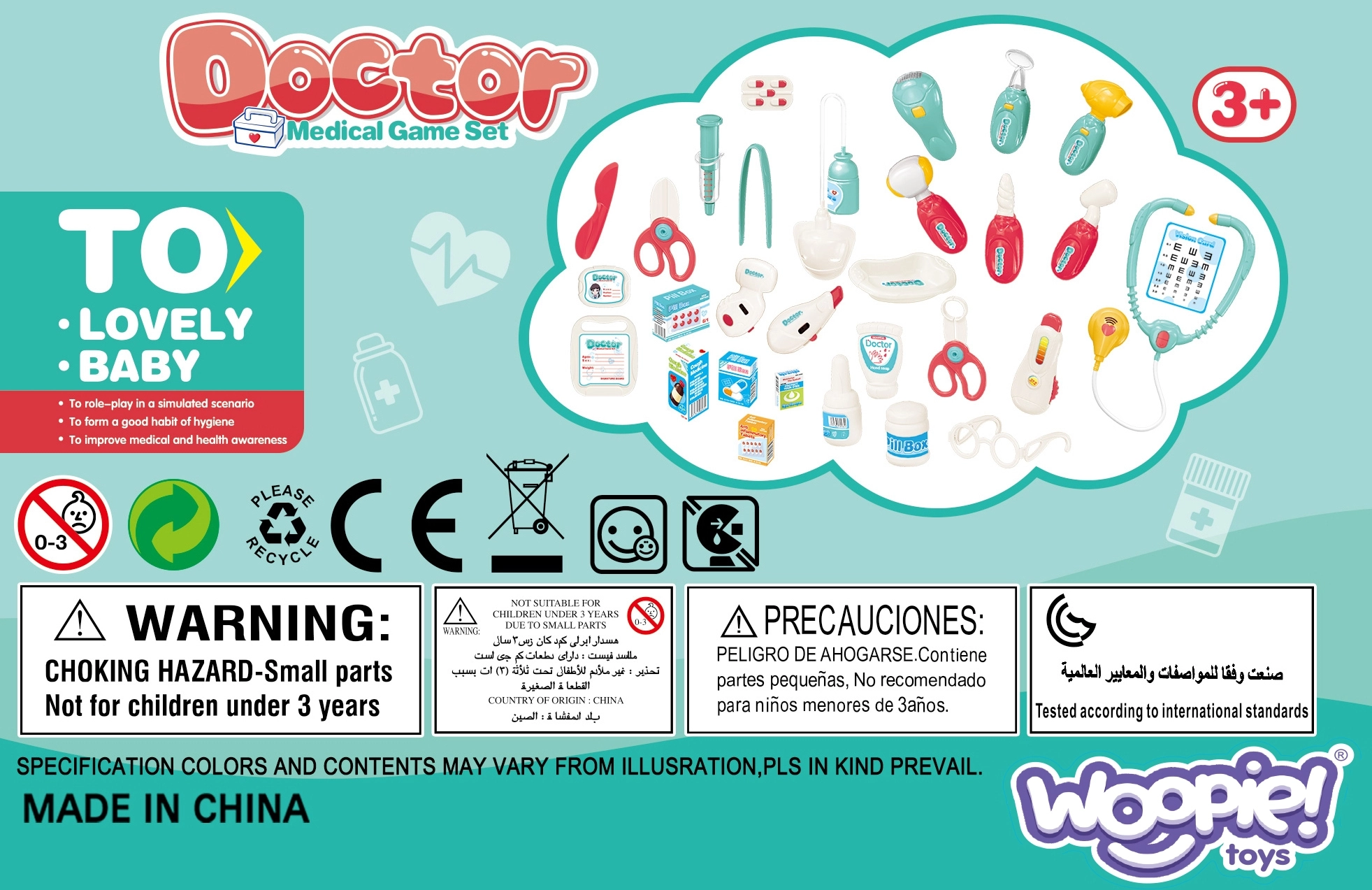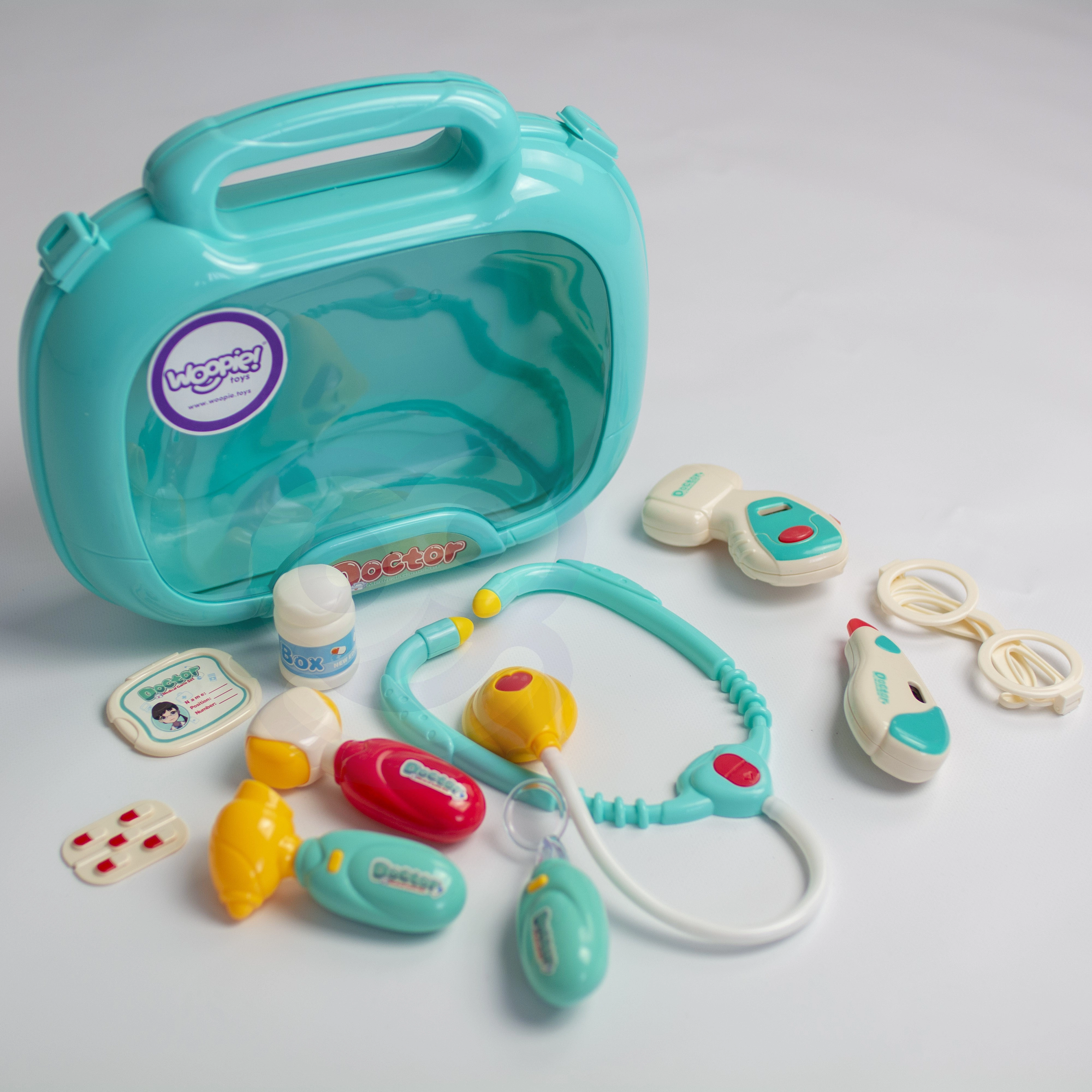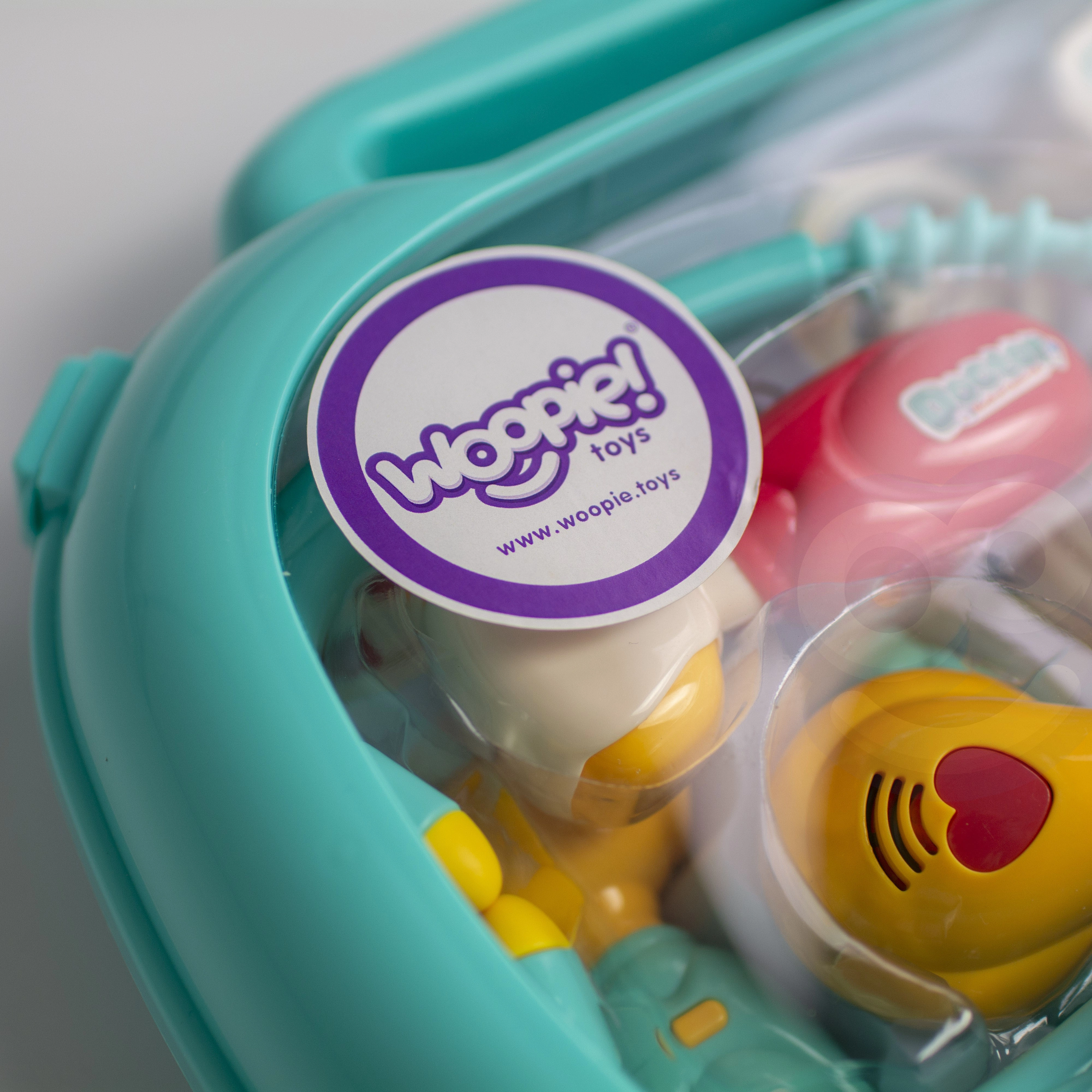 Το σετ για μικρούς γιατρούς από τη Woopie προσφέρει πλούσιο εξοπλισμό και ρεαλιστικές λειτουργίες που ενθουσιάζουν τα παιδιά. Το στηθοσκόπιο έχει άνετα ακουστικά, κατά την εξέταση αναβοσβήνει και αναπαράγει χτύπο καρδιάς. Το πιεσόμετρο προσφέρει 3 μετρήσεις και οπισθοφωτιζόμενη οθόνη, το θερμόμετρο δείχνει μία από τις 3 θερμοκρασίες (ρύθμιση με περιστροφικό κουμπί) και το αποτέλεσμα φωτίζεται. Το ωτοσκόπιο και ο χειροκίνητος καθρέφτης διαθέτουν φωτάκια για ακόμη μεγαλύτερη αυθεντικότητα στο παιχνίδι.