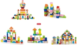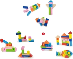 Τουβλάκια σε διάφορα σχήματα – κύβοι, κύλινδροι, καμάρες και σκεπές – εμπνέουν τη δημιουργία πύργων, σπιτιών και φανταστικών κατασκευών, καλλιεργώντας τη δημιουργικότητα.