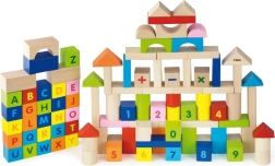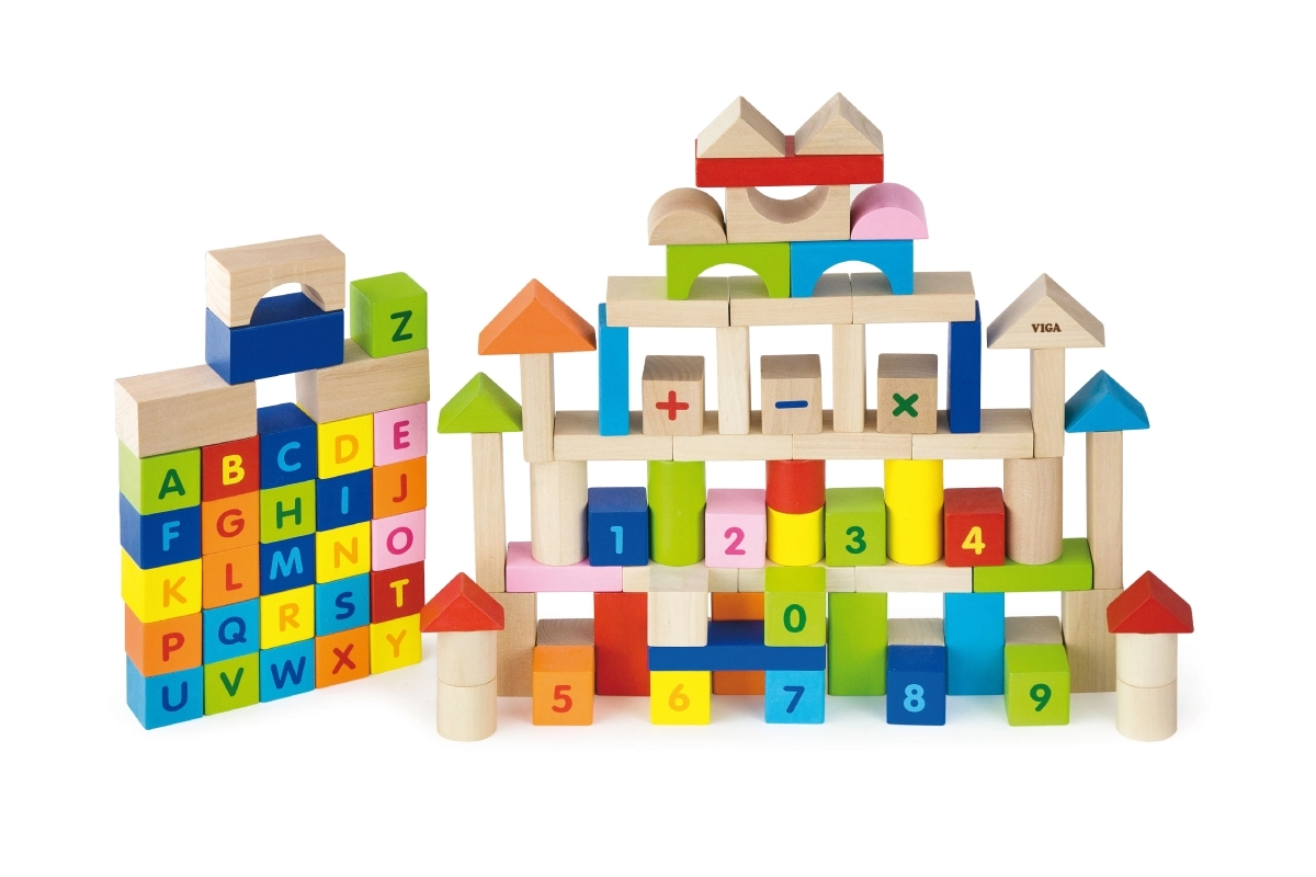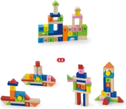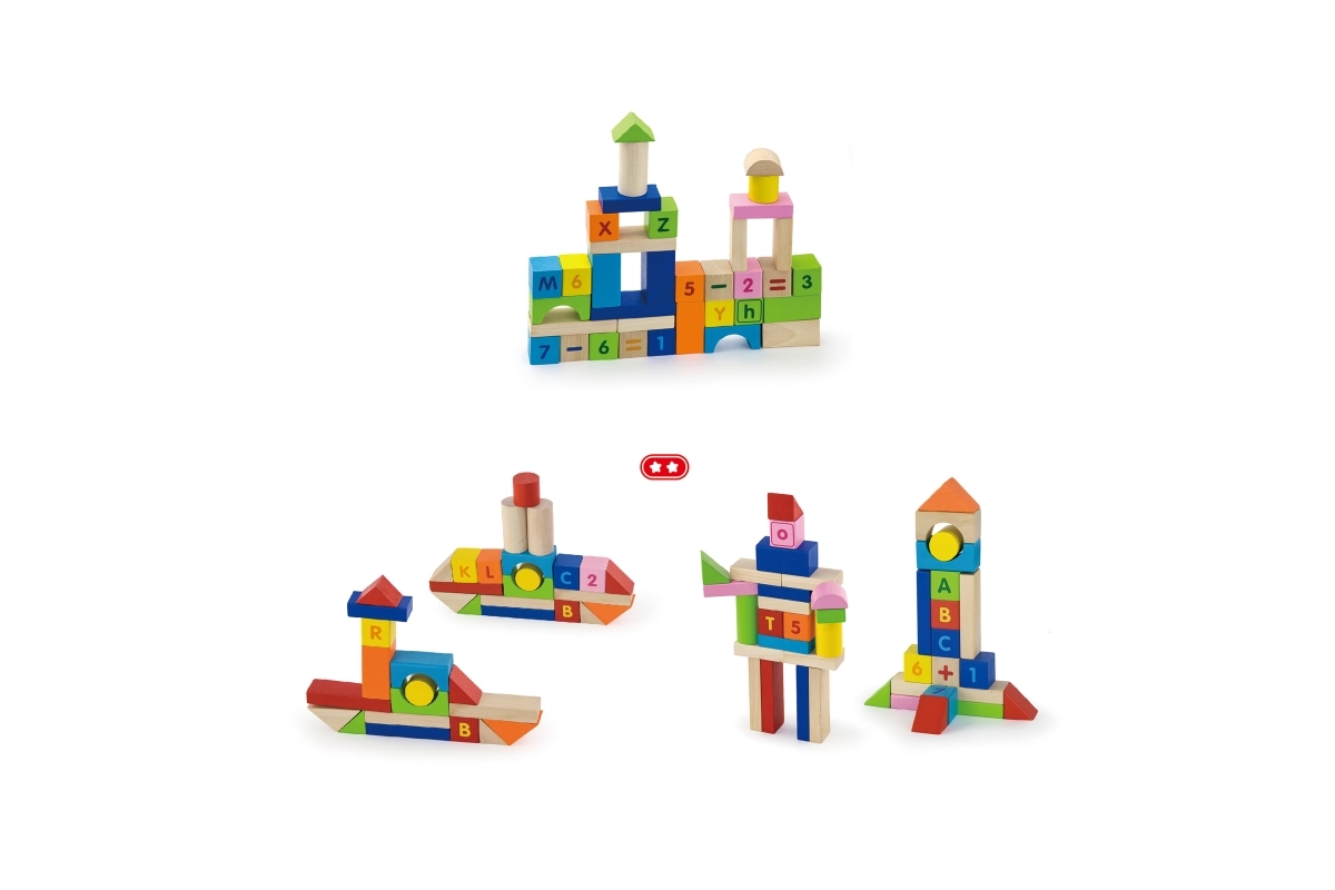 Πολύχρωμα τουβλάκια από ανθεκτικό ξύλο με εκτύπωση γραμμάτων, αριθμών και μαθηματικών σημείων υποστηρίζουν τη μάθηση μέσα από το παιχνίδι και αντέχουν στην καθημερινή χρήση.