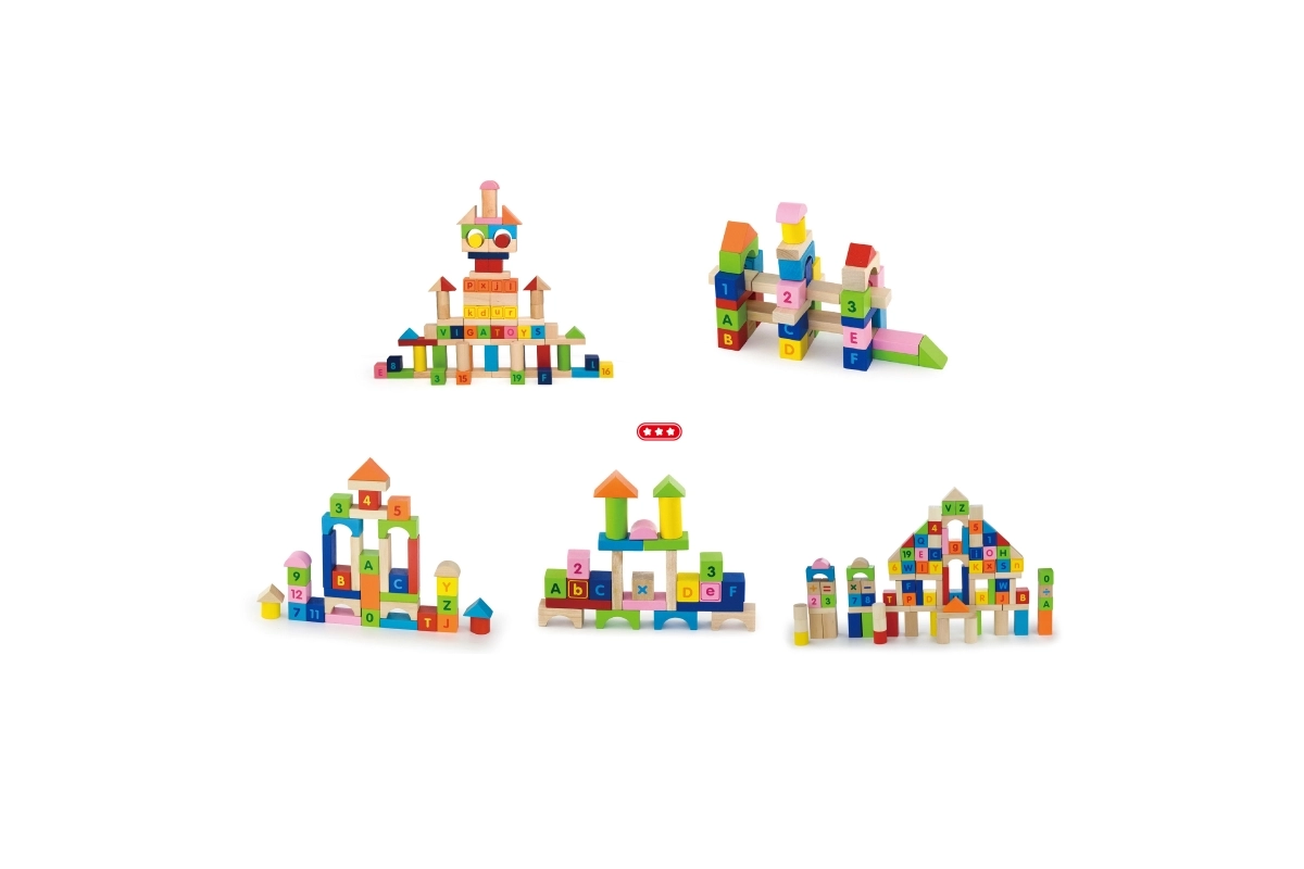 Αυτό το πολύχρωμο σετ 100 ξύλινων τουβλακίων VIGA, εμπνευσμένο από τις αρχές Montessori, προσφέρει στα παιδιά χαρά στην ανακάλυψη γραμμάτων, αριθμών και απλών αριθμητικών ασκήσεων. Χάρη στα διαφορετικά σχήματα – τουβλάκια, κύλιντροι, καμάρες και σκεπές – τα παιδιά μπορούν να χτίζουν πόλεις, πύργους και φανταστικές κατασκευές, εξασκώντας διακριτικά το αλφάβητο, την αριθμητική και τα χρώματα.